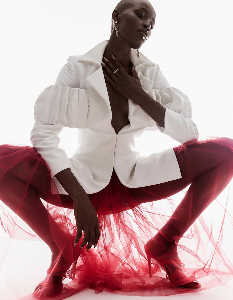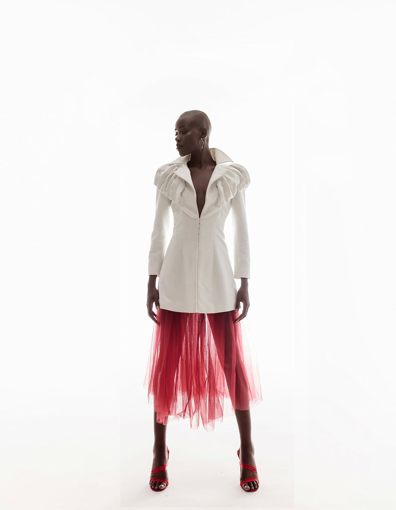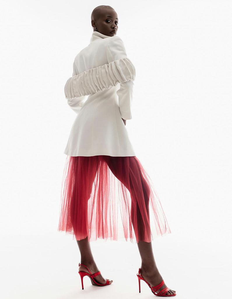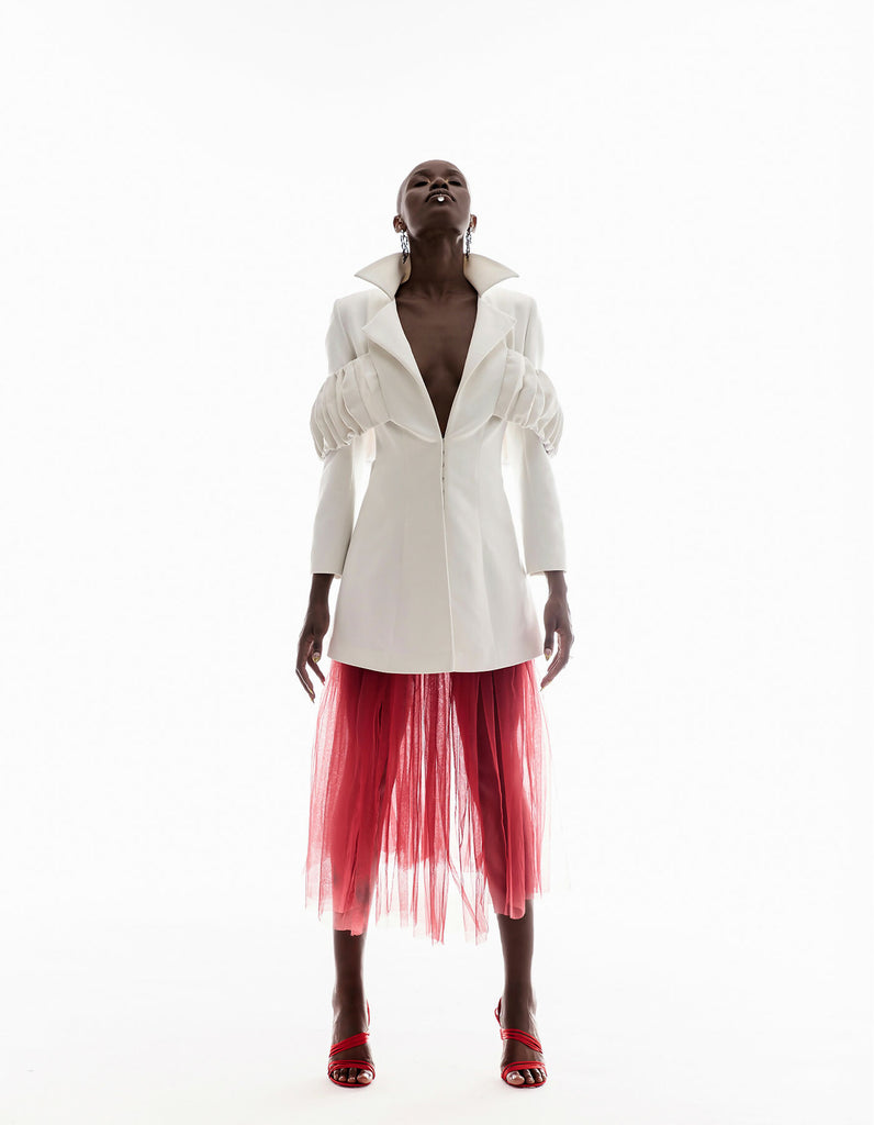 Elevate your look with this distinctive creation: a white jacket in scuba paired with a gathered mid-length skirt. The single-breasted blazer boasts exaggerated 3D geometric manipulation, seamlessly attached from the front all the way to the back. Featuring a stylish collar and single hook-and-eye closure in silver, this jacket is both sophisticated and avant-garde.