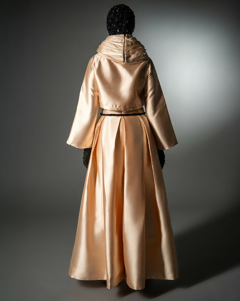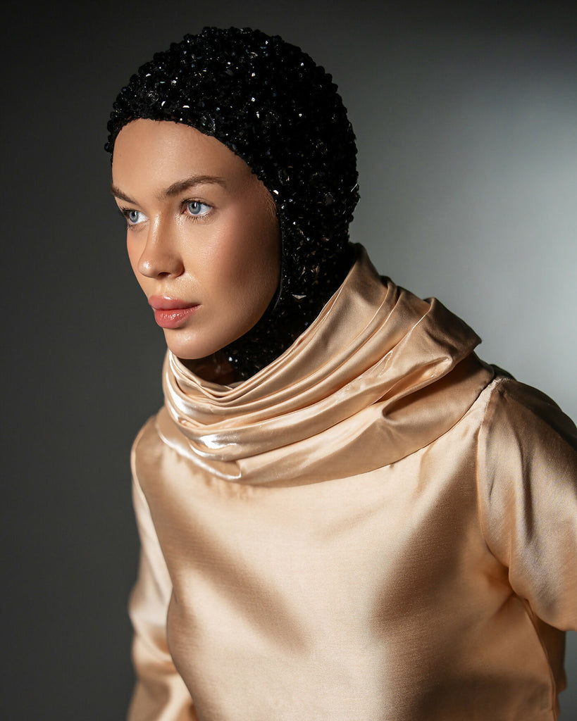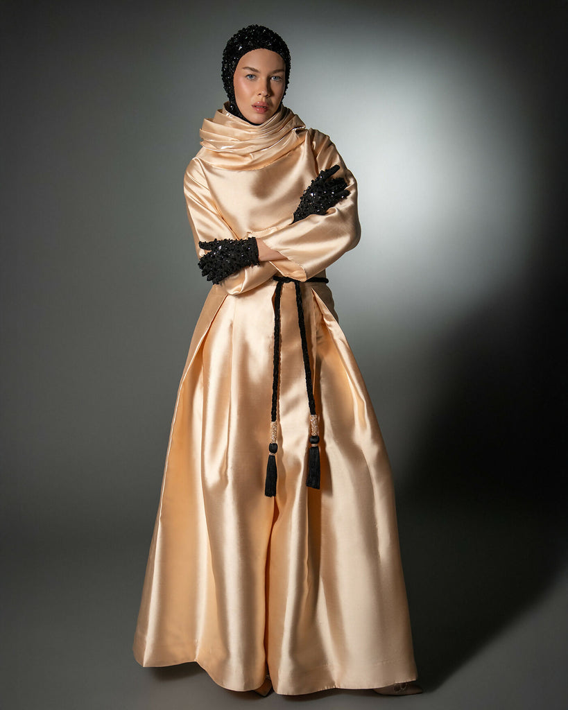 The Amal Set is a luxurious couture ensemble crafted from luminous champagne satin, designed to merge modest elegance with sculptural sophistication. The silhouette features a draped, high-fold neckline that frames the face with structured softness, creating a dramatic and refined presence.