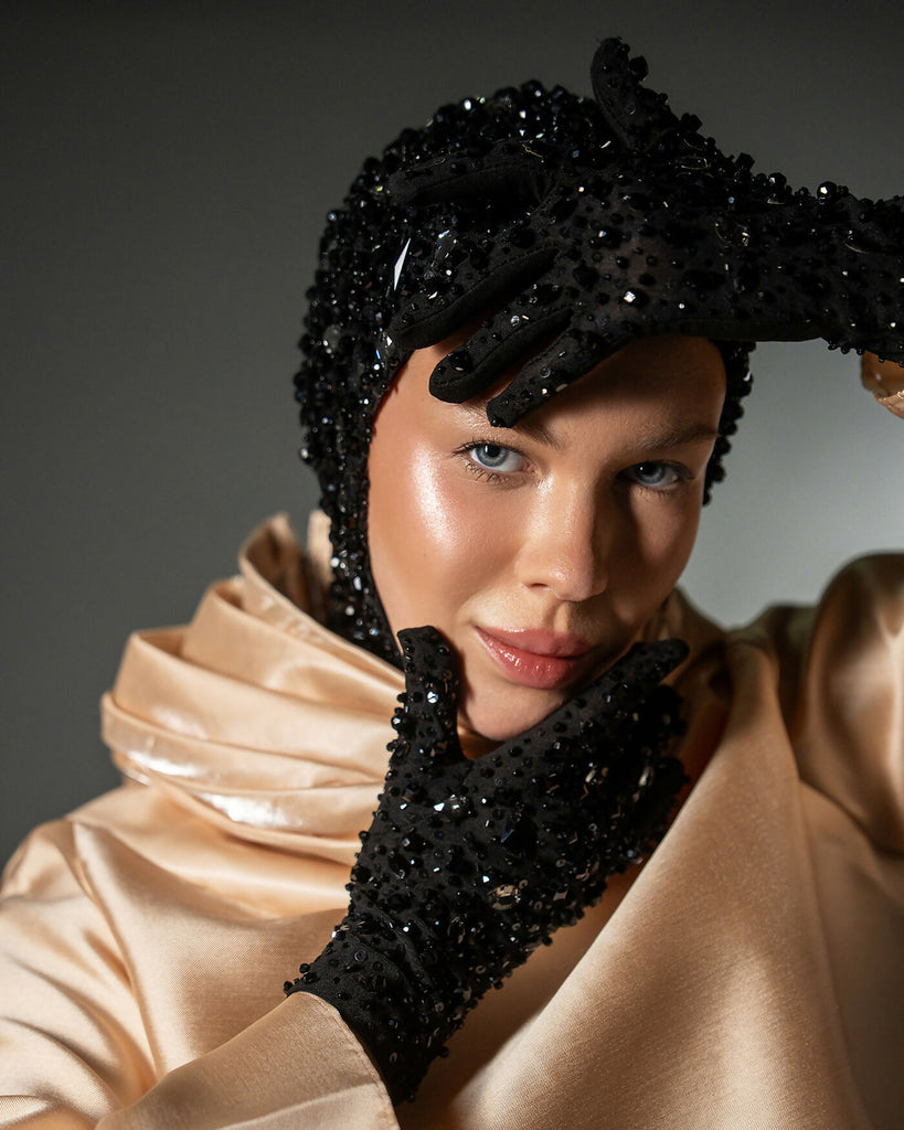 The Amal Set includes hand-beaded black gloves and a hand-beaded headpiece, adding intensity, contrast, and artisanal depth. A long handcrafted braided belt with tassels cinches the waist, merging traditional Palestinian craftsmanship with contemporary couture form.