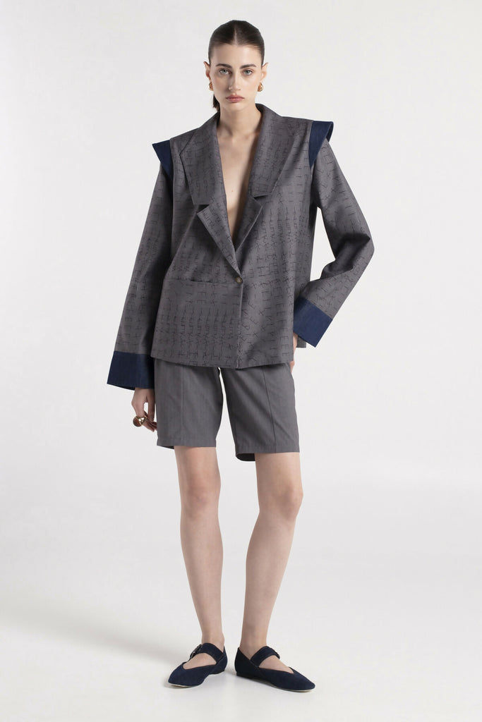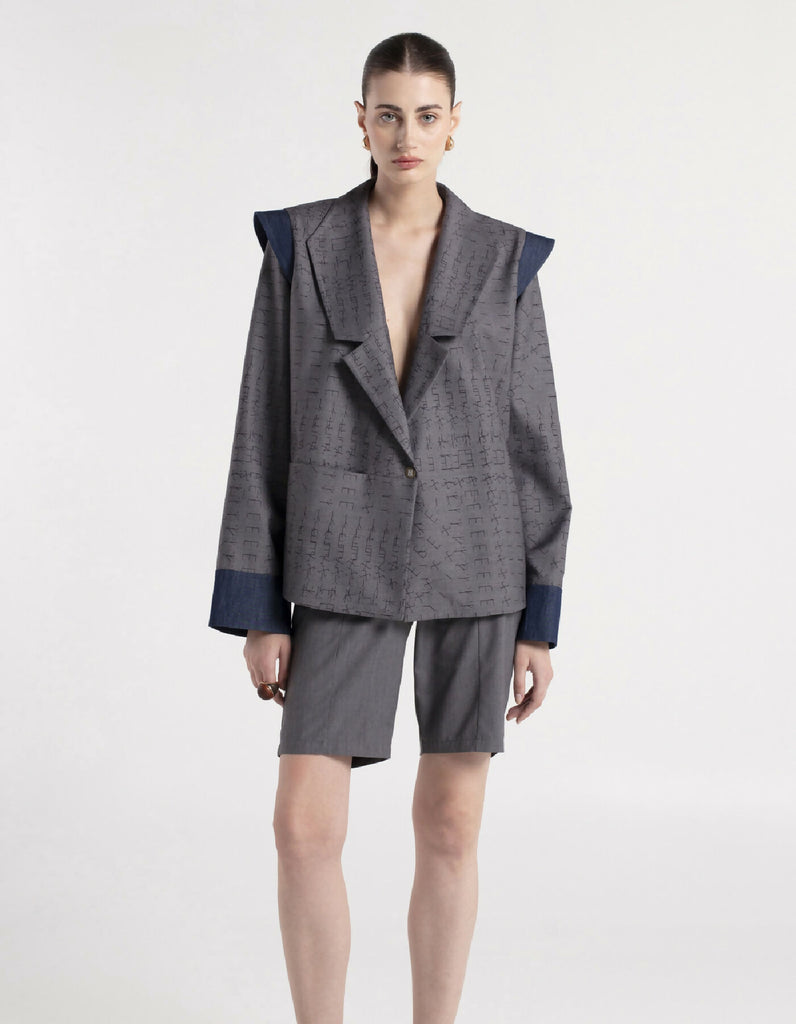 Asymmetric Collar Denim Detailed Oversize Gray Jacket
