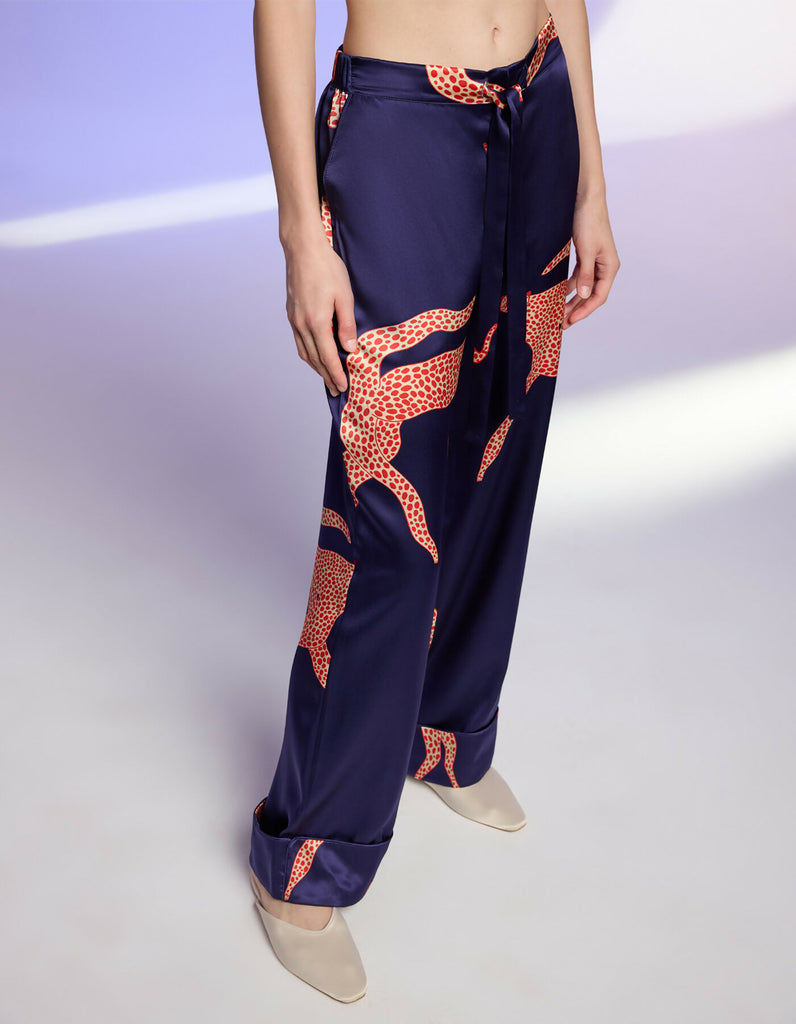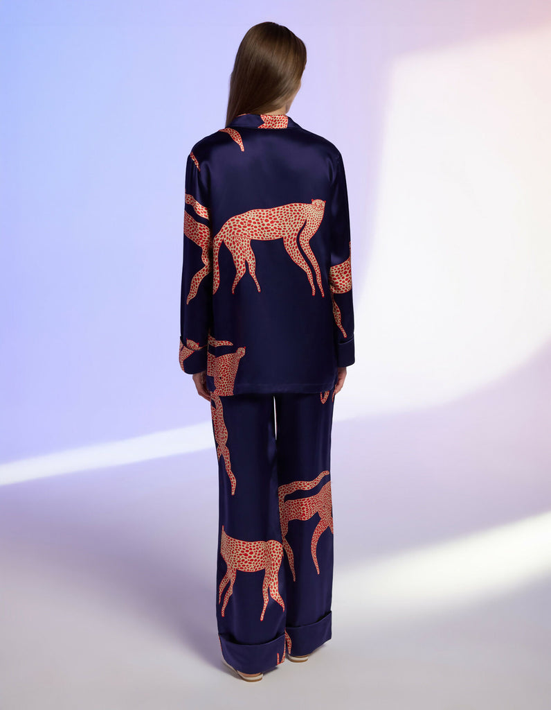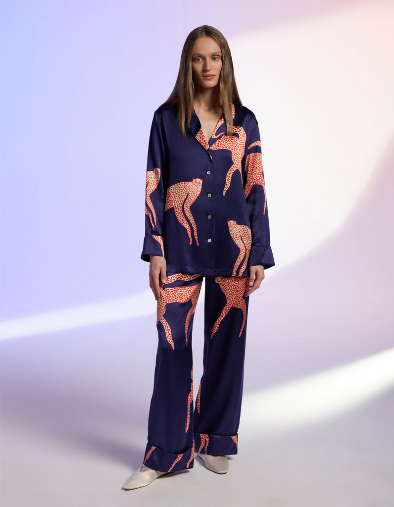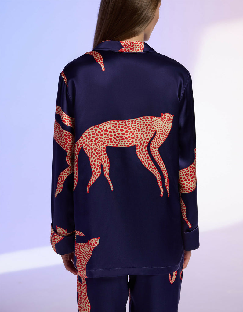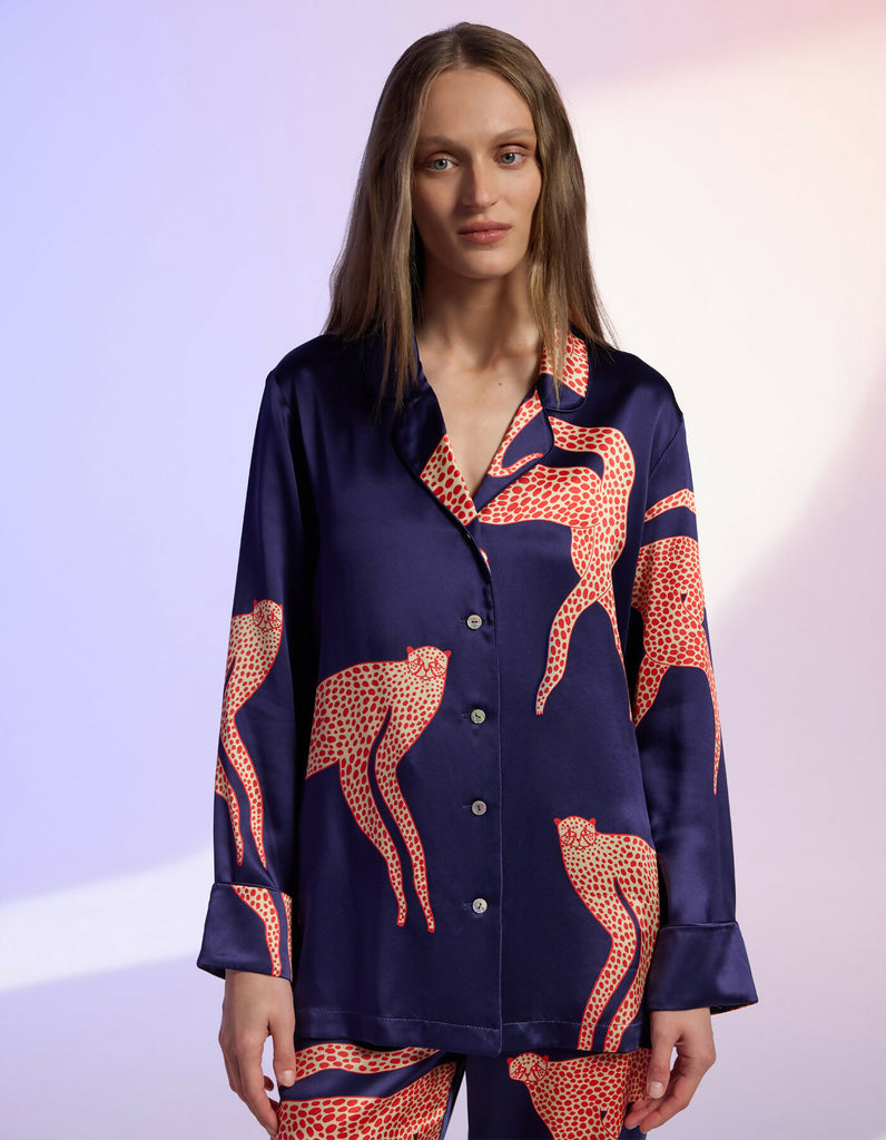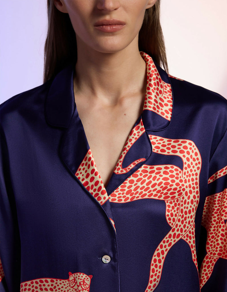This long pyjama set is crafted from deep blue silk and finished with elegant shell buttons. The exclusive print is created by British illustrator Ashley Percival, who has collaborated with Gucci and other global brands. Each garment is hand-cut to respect the artist’s print, ensuring thoughtful placement and making every piece uniquely yours.