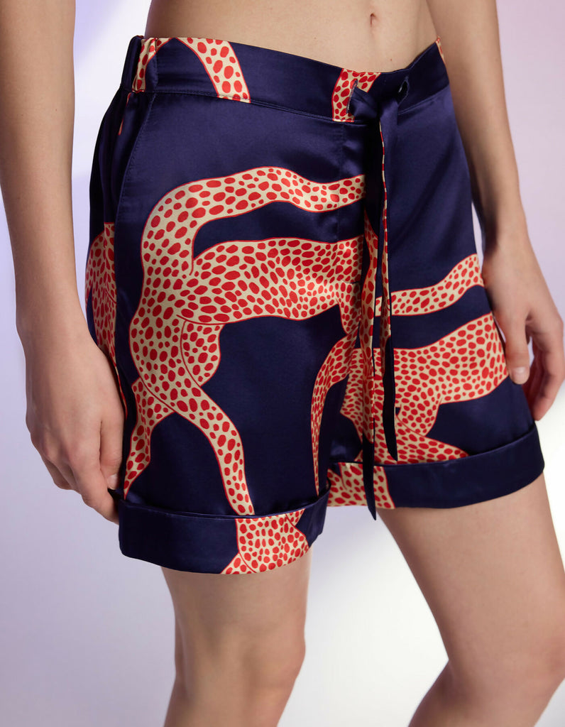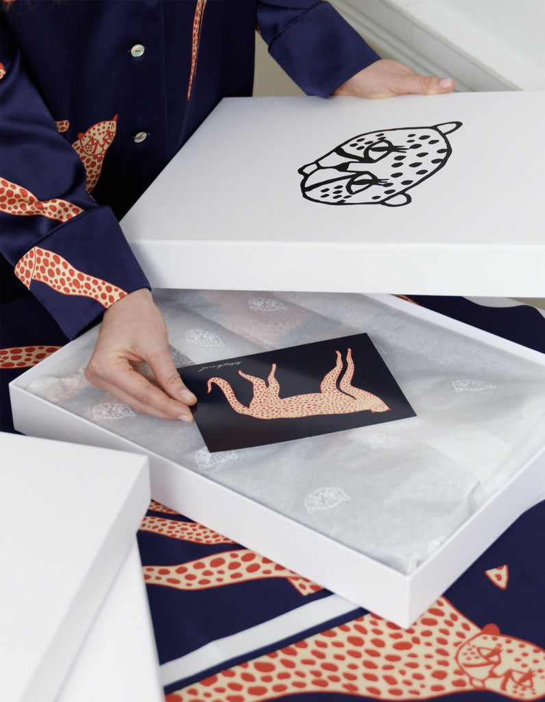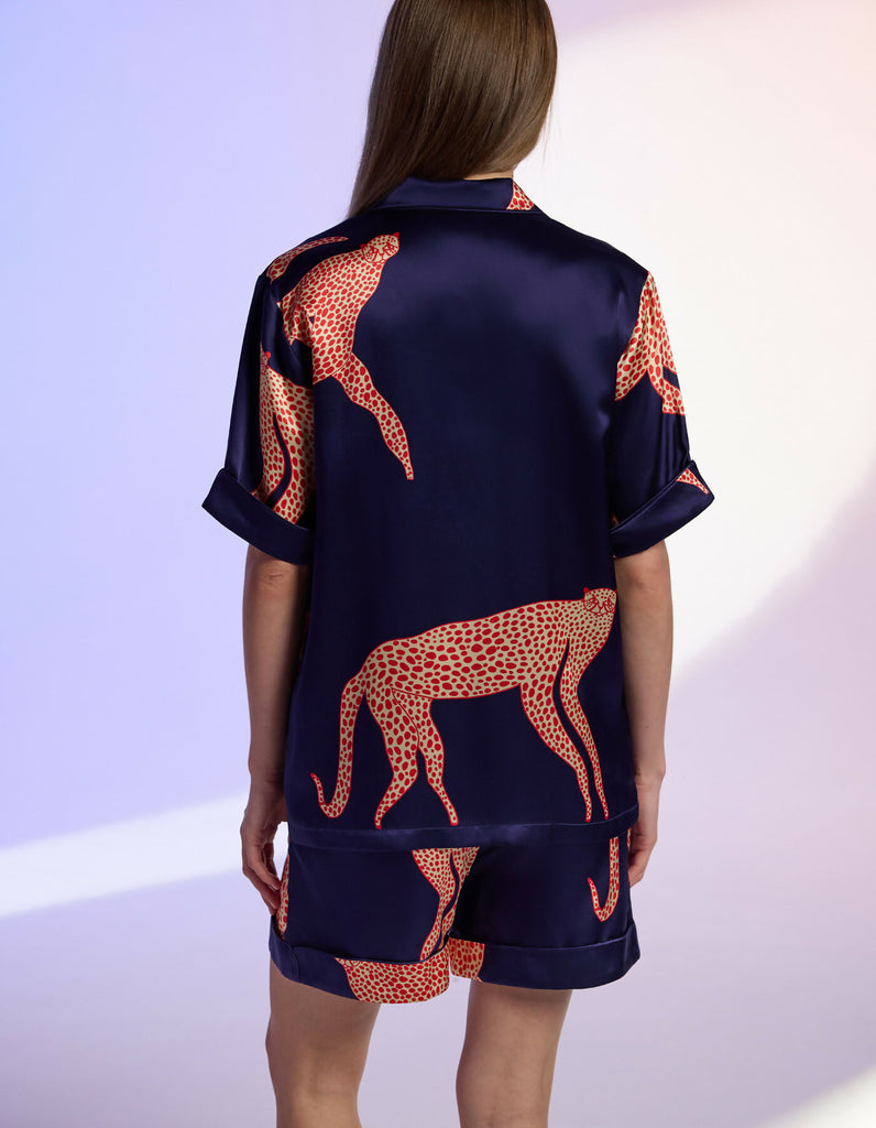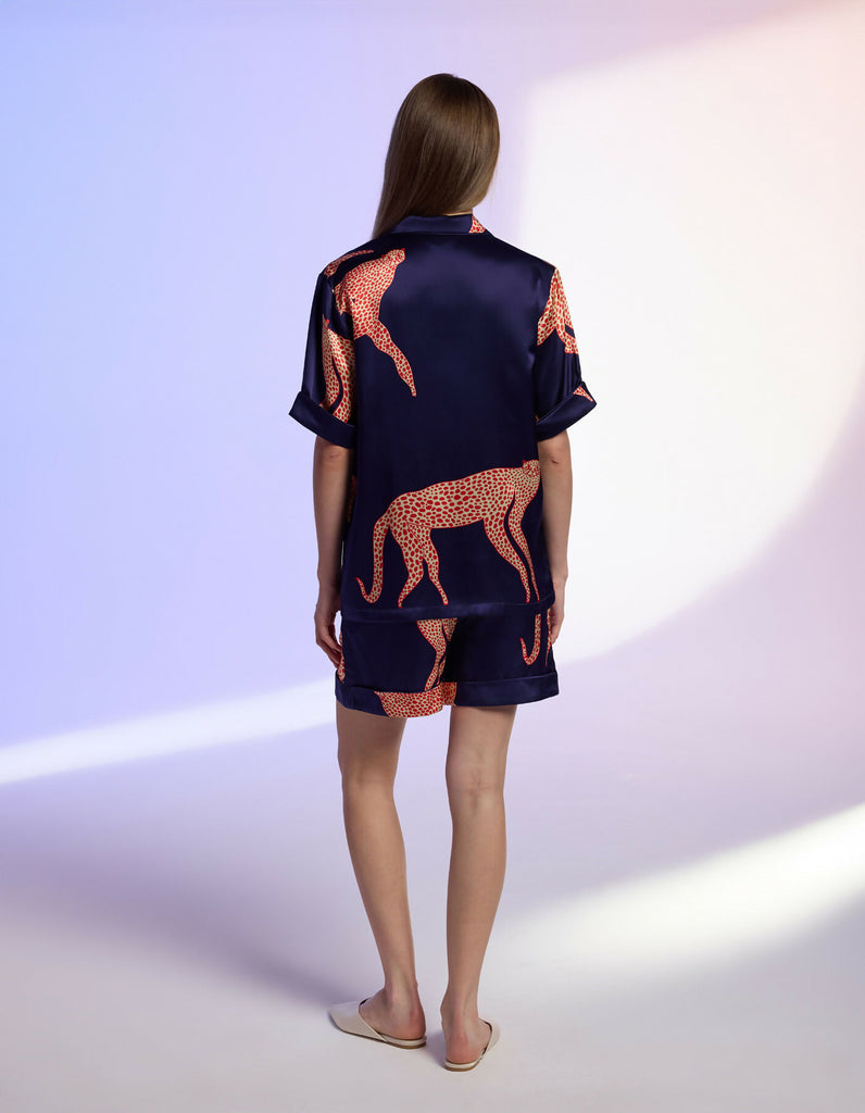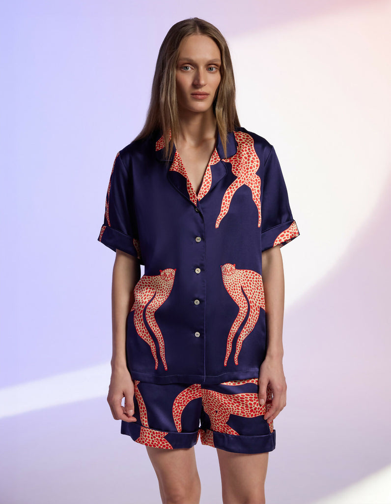 This playful short pajama set is tailored from lustrous blue silk, highlighted with sleek silk trim and finished with delicate natural shell buttons. The exclusive print is created by British illustrator Ashley Percival, who has collaborated with Gucci and other global brands. Featuring bold red cheetahs against the cool blue background, each piece is precisely hand-cut to respect the artwork’s flow, making every set a true original.