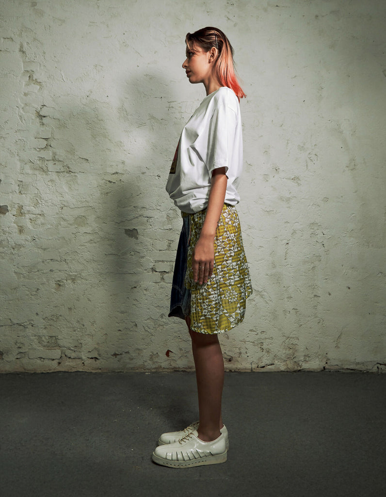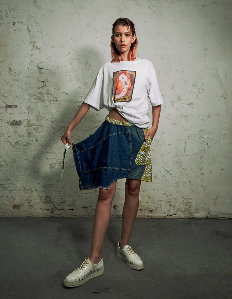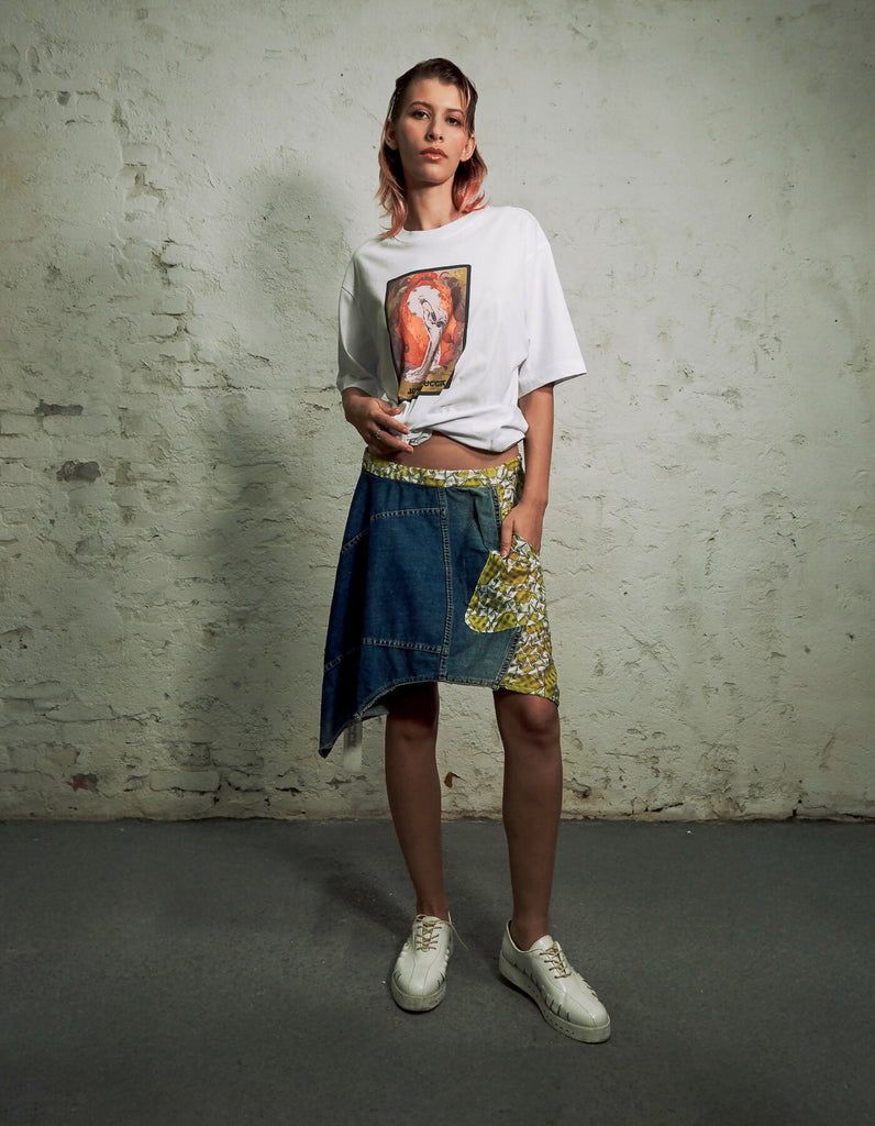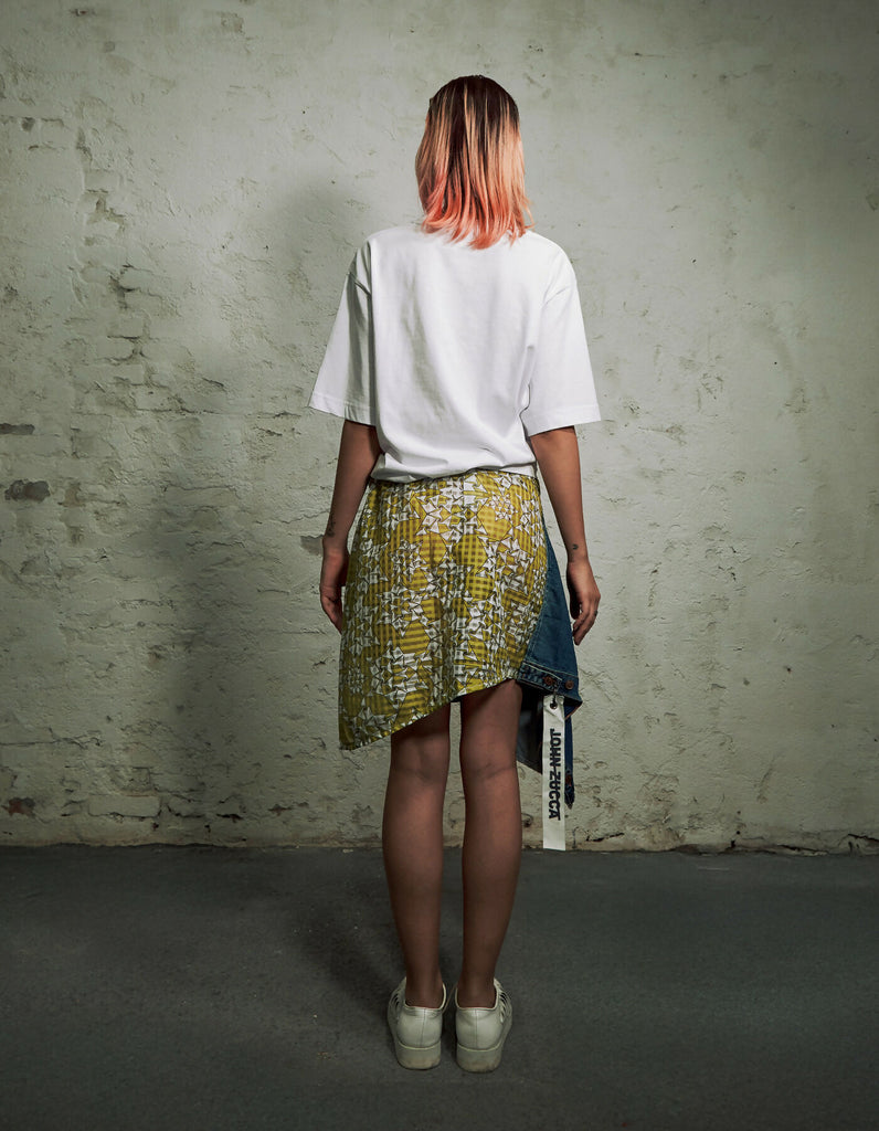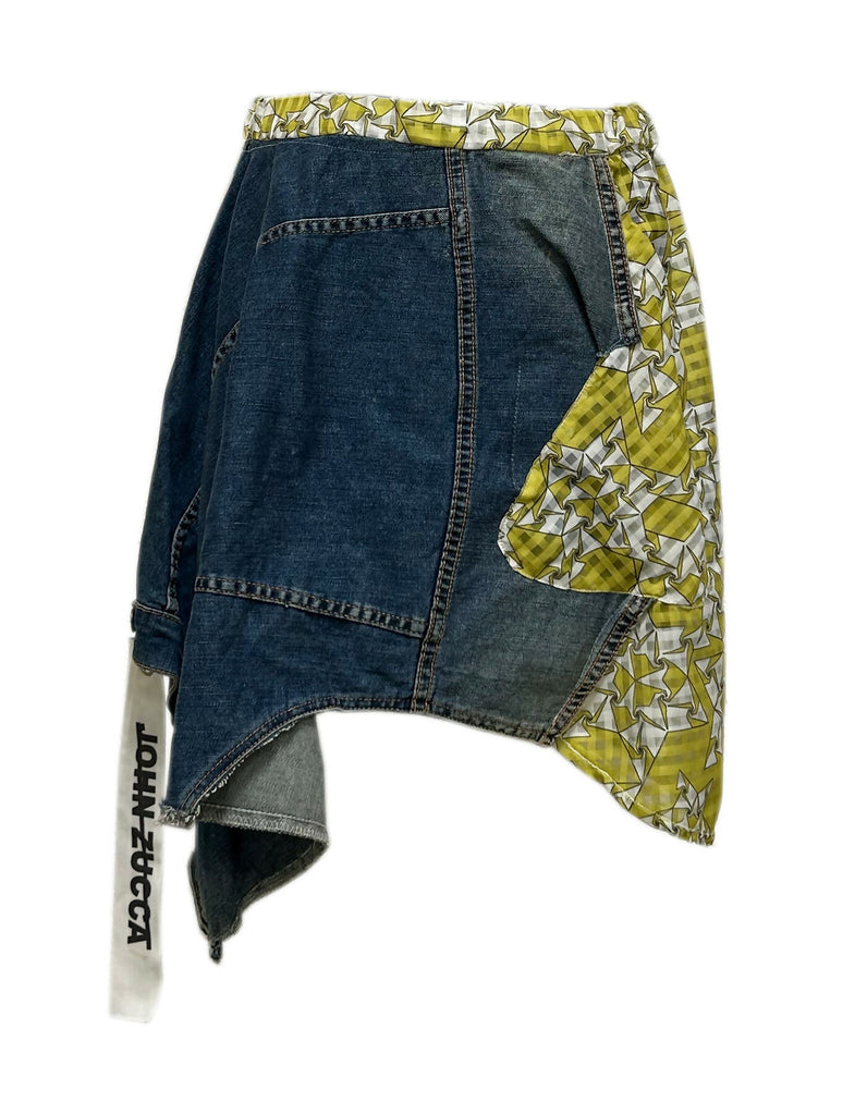 Introducing the Deconstructed Denim Skirt from John Zucca's green line, crafted from remade secondhand materials. This limited item features a deconstructed design with an A-line silhouette, elastic waistband, and front pockets for added functionality. The skirt boasts a unique pattern textile design, a straight hem, and an unlined finish for a relaxed feel. Made in Italy, it measures 45 cm in length and combines CO 100% and Polyester 100% for a stylish and sustainable choice. Add a touch of eco-conscious elegance to your wardrobe with this exclusive John Zucca piece.