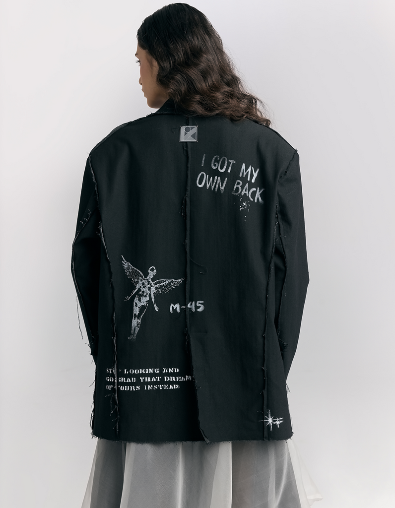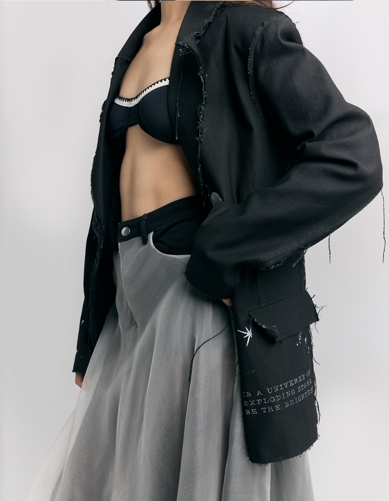 The M45 Black Denim Block Printed Blazer is crafted in denim and designed in an oversized silhouette with sculpted, padded shoulders. Exposed raw seams run throughout the piece, creating a deconstructed, textured look, while celestial-inspired block prints add character and depth. The inner surface features a contrasting textured finish for an unexpected visual detail. Completed with a single front button closure, this jacket blends structure, craft, and cosmic influence — a signature of the M45 collection.