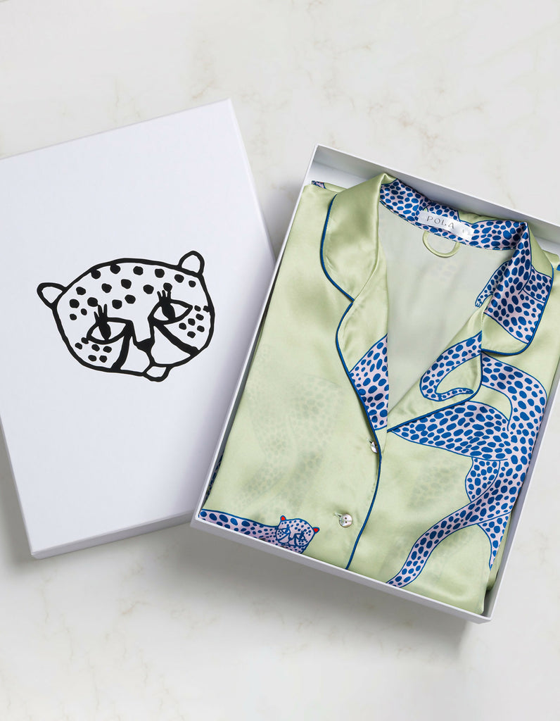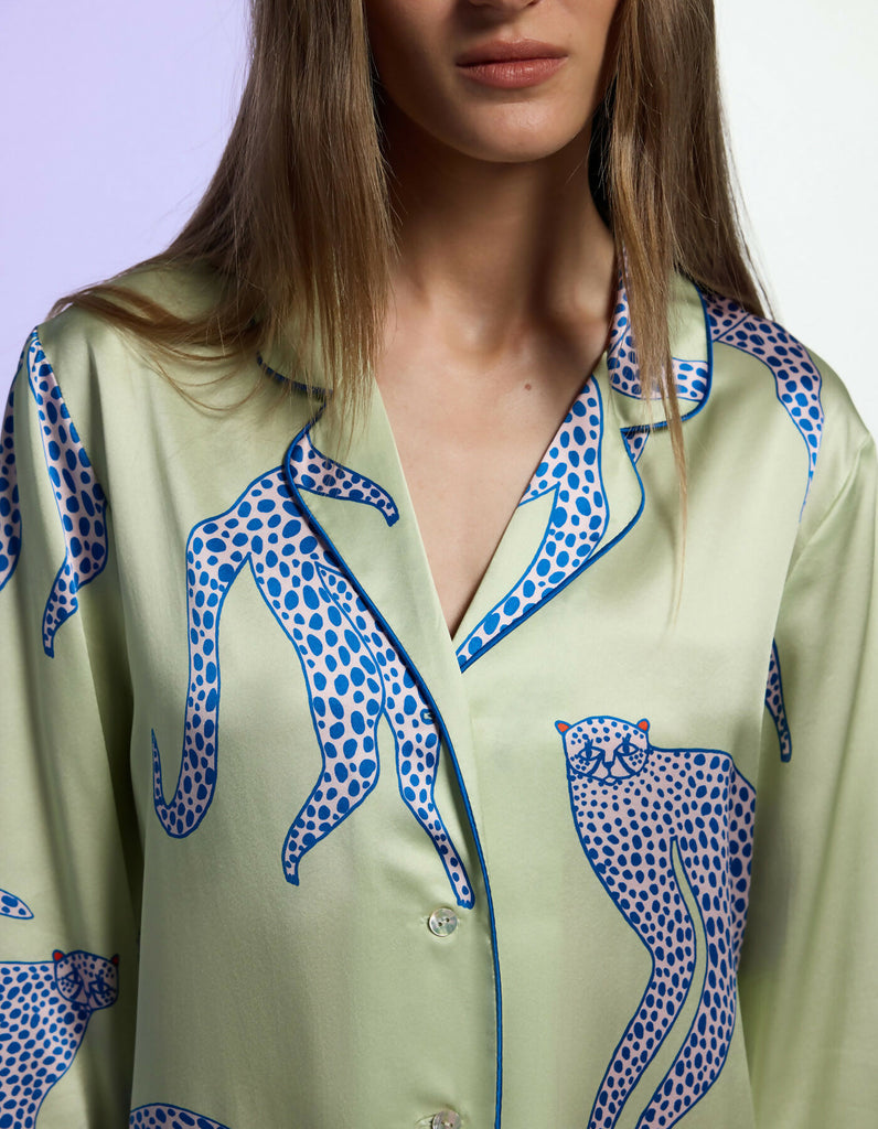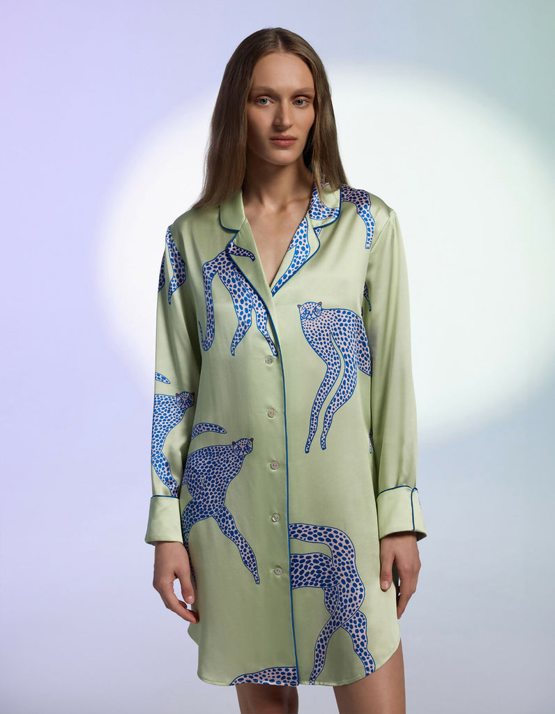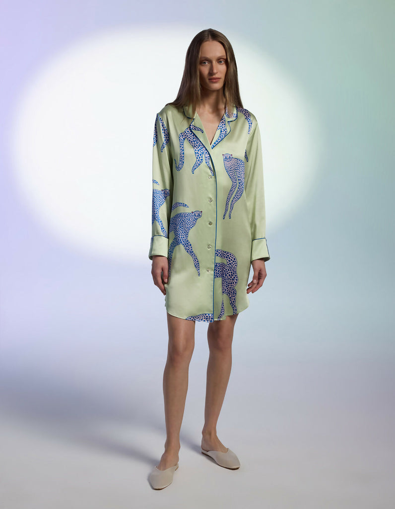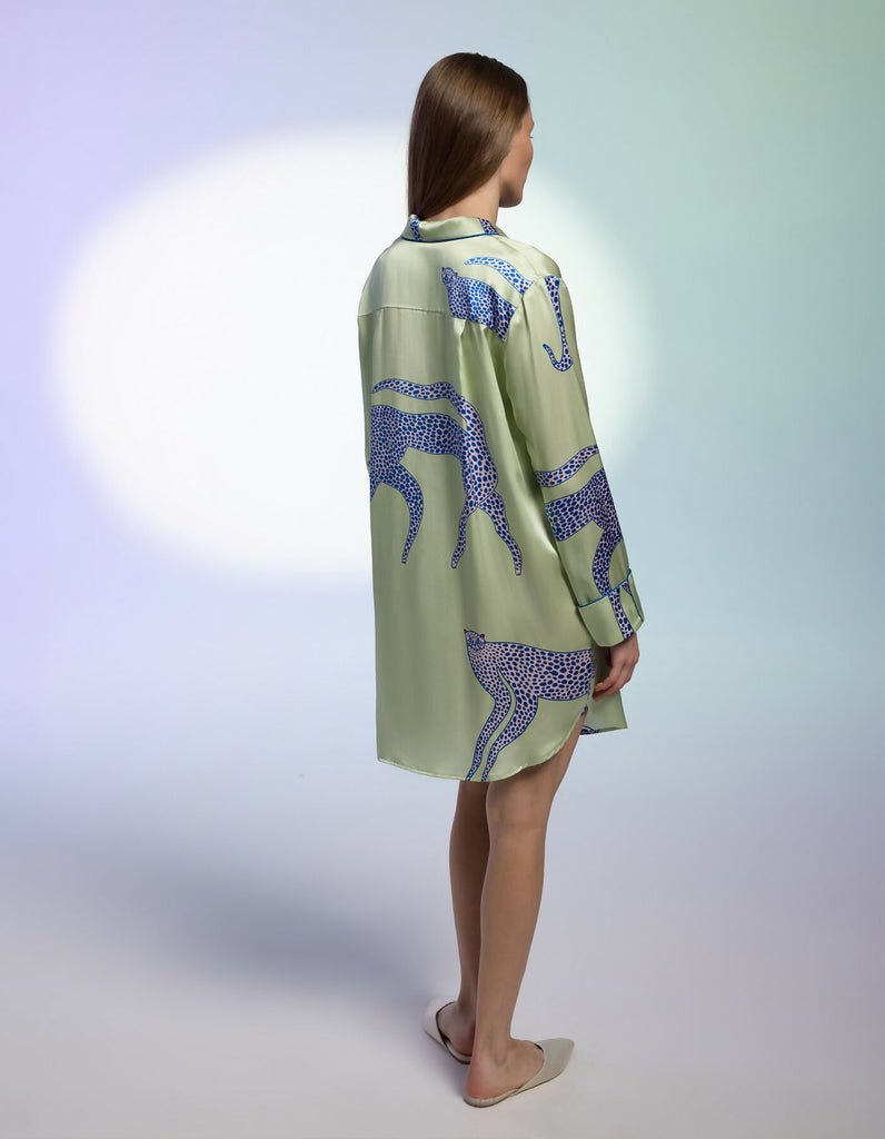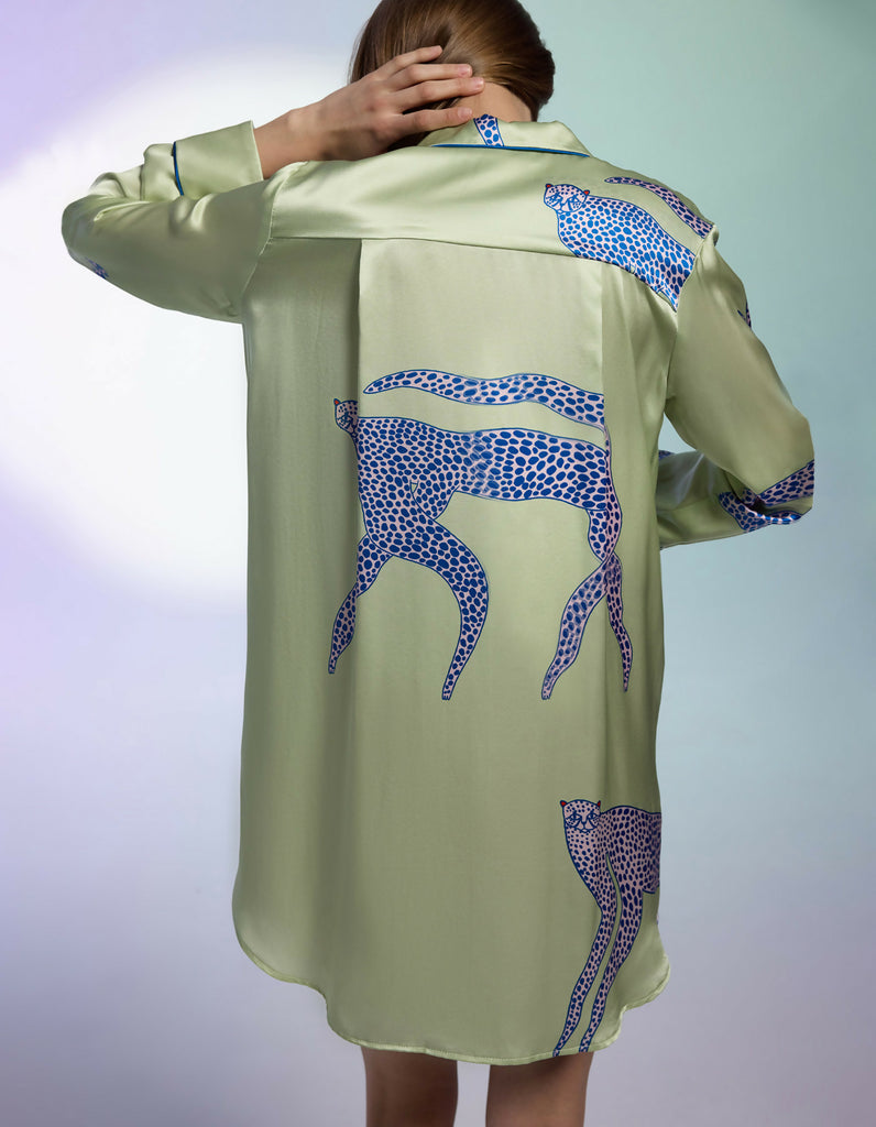 This luxurious nightshirt is crafted from soft green natural silk, featuring vibrant pink cheetah print and finished with delicate natural shell buttons. The exclusive print is created by British illustrator Ashley Percival, who has collaborated with Gucci and other global brands. Each piece is thoughtfully hand-cut to follow the flow of the artwork, ensuring that every nightshirt is uniquely yours.