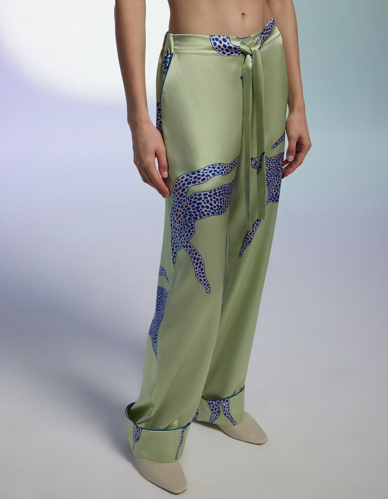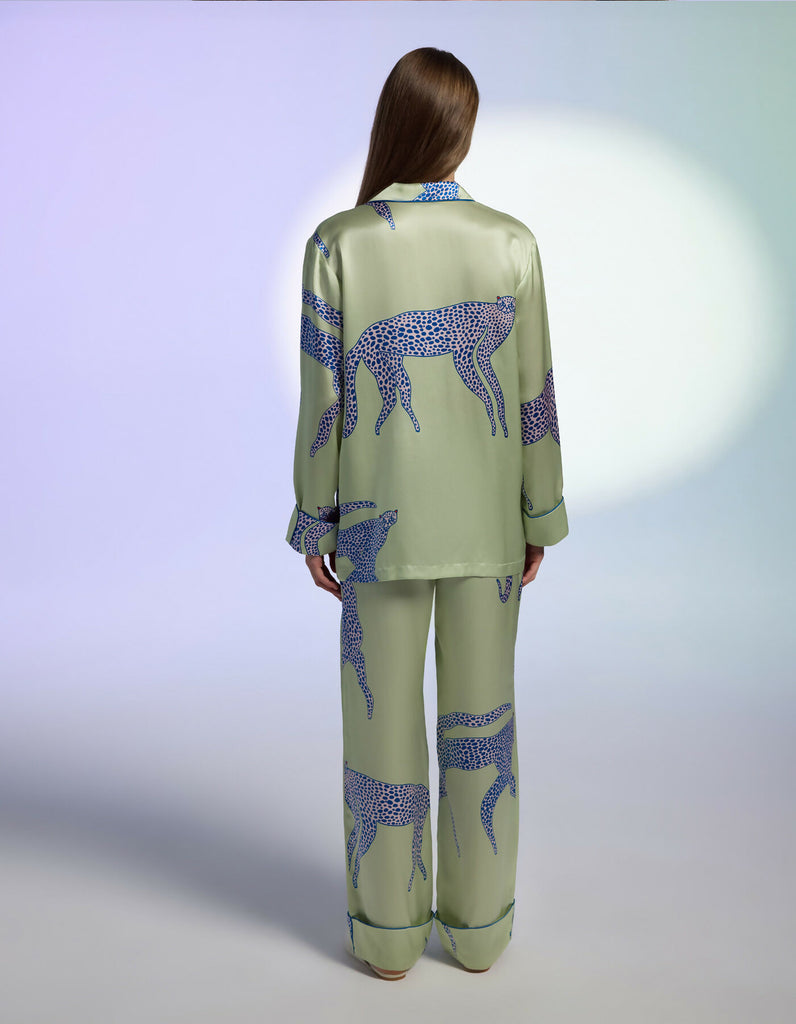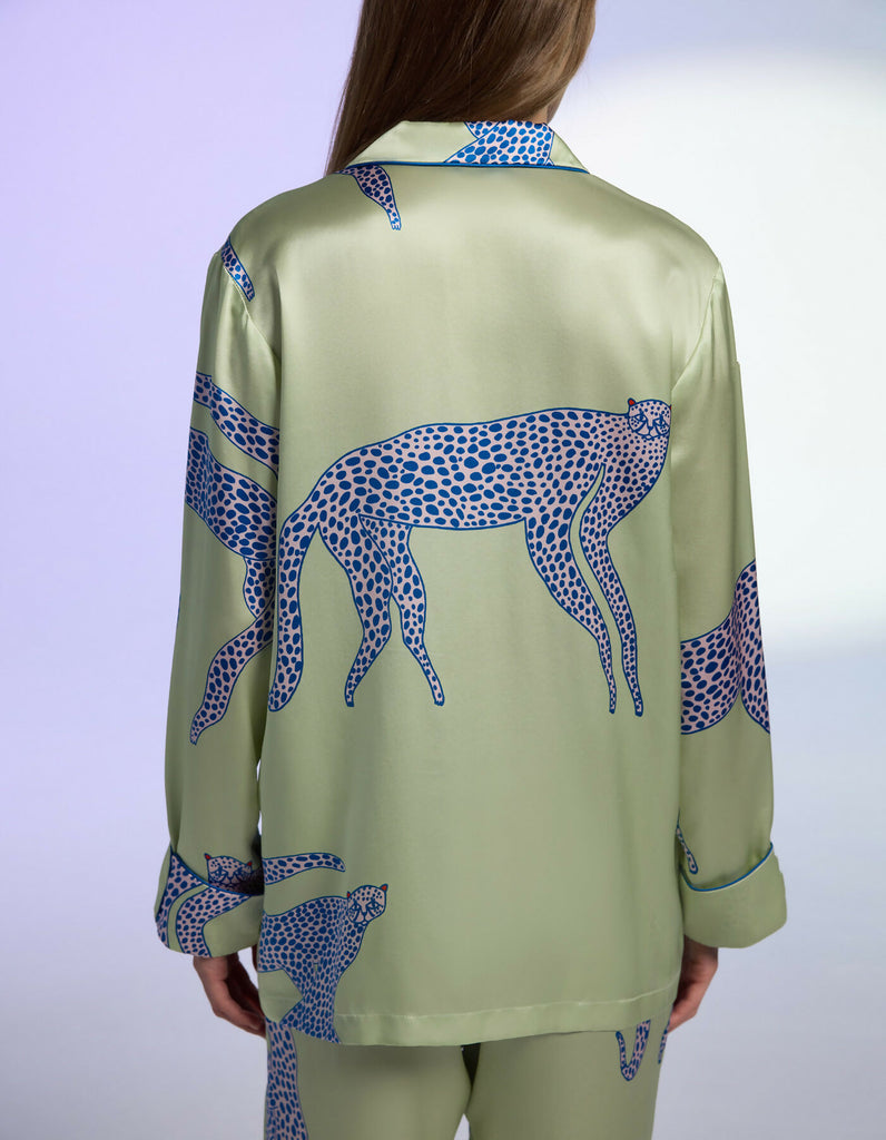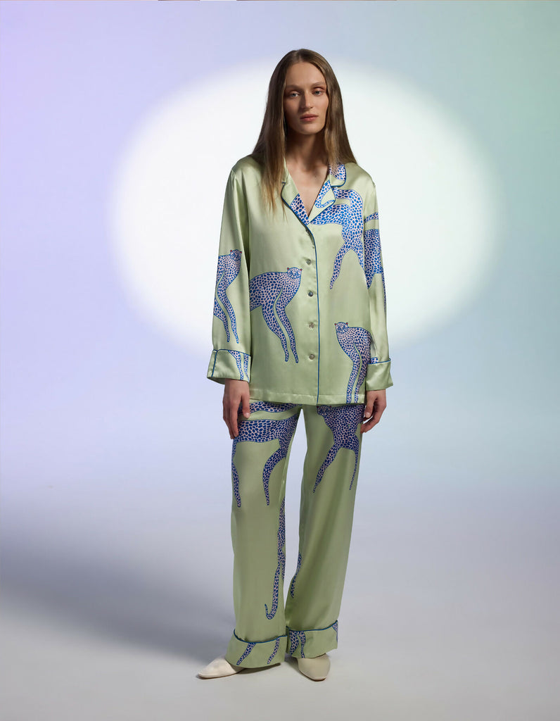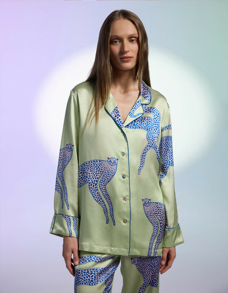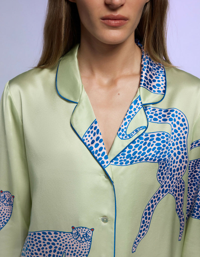 This refined pyjamas is crafted from light green natural silk, finished with vibrant silk trim in a striking blue shade and detailed with natural shell buttons. The exclusive cheetah print is created by British illustrator Ashley Percival, who has collaborated with Gucci and other global brands. Each piece is carefully hand-cut to honor the artwork’s flow, giving every garment its own distinctive character.