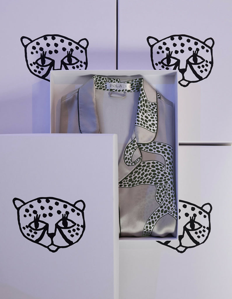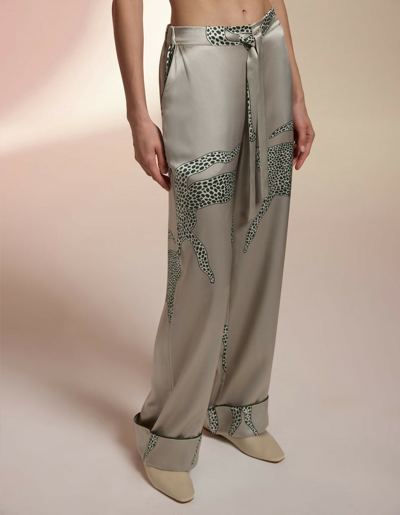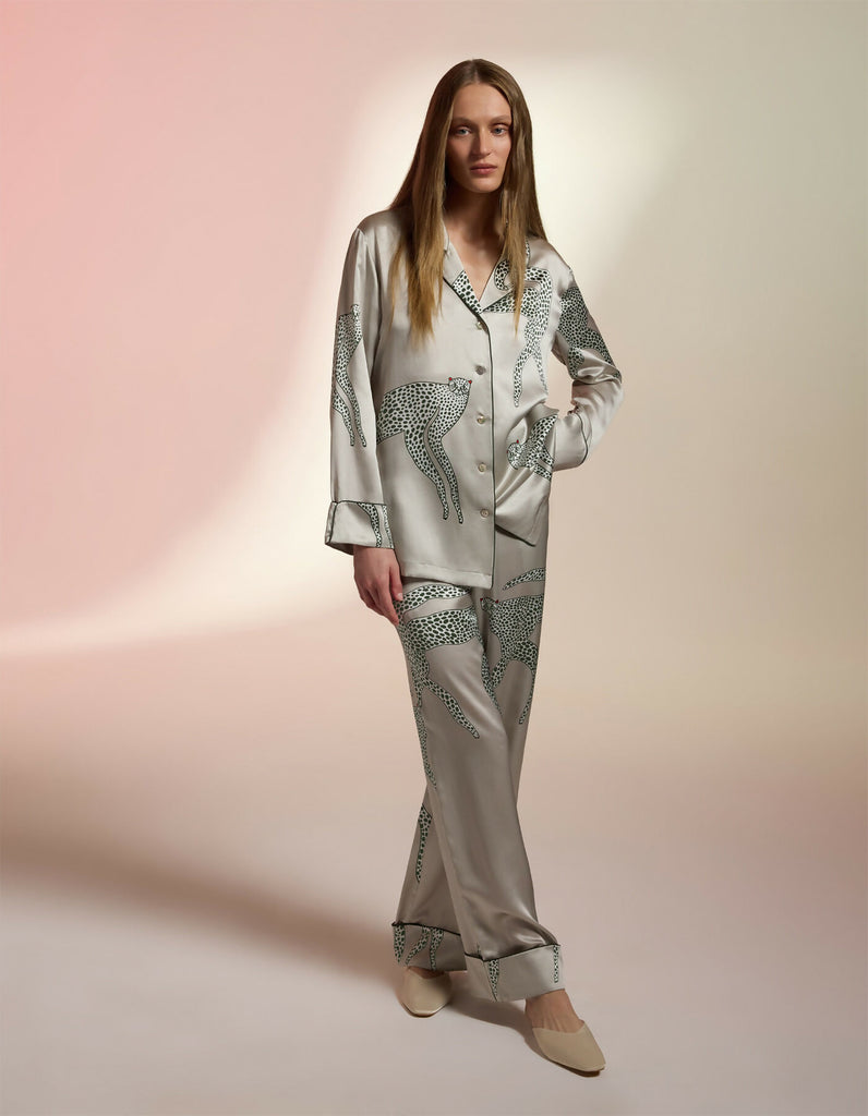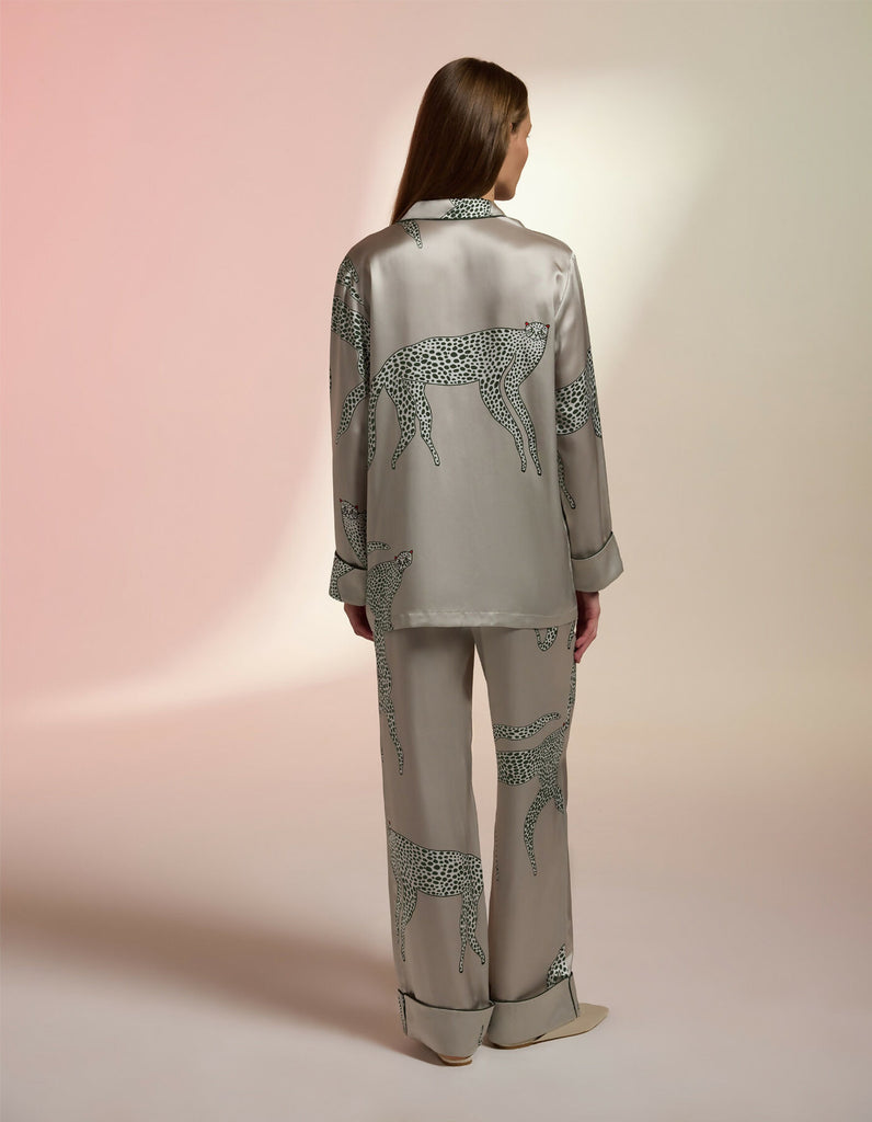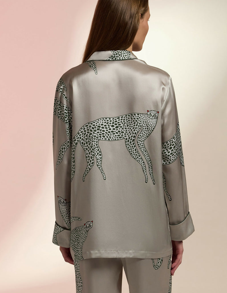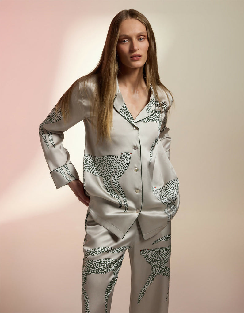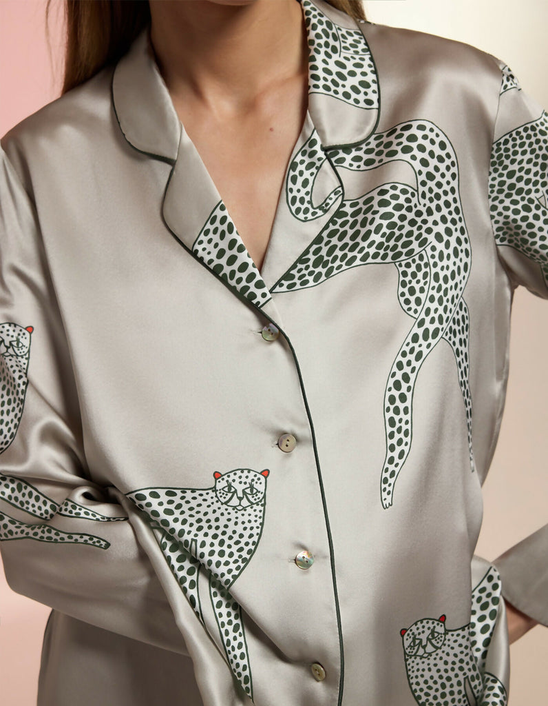 This elegant loungewear set is made from pearl grey silk and accented with deep green trim, completed by natural shell buttons for a refined finish. The exclusive print is created by British illustrator Ashley Percival, who has collaborated with Gucci and other global brands. Each garment is individually hand-cut to preserve the balance of the design, ensuring that every piece feels one of a kind.