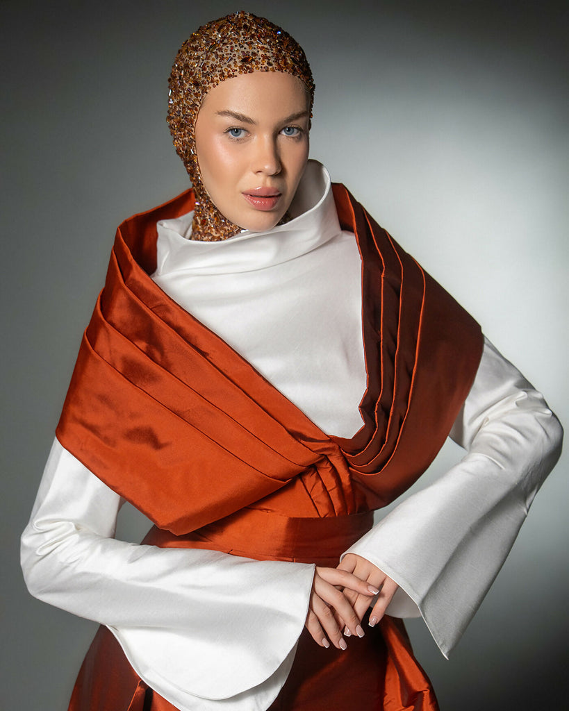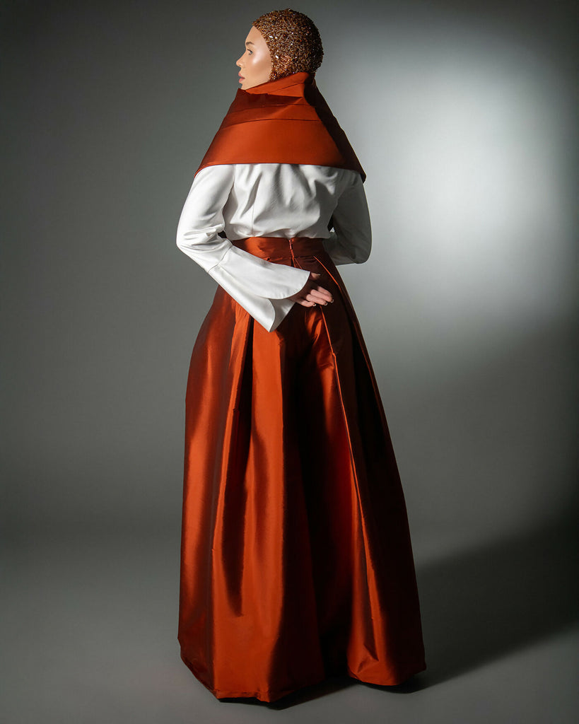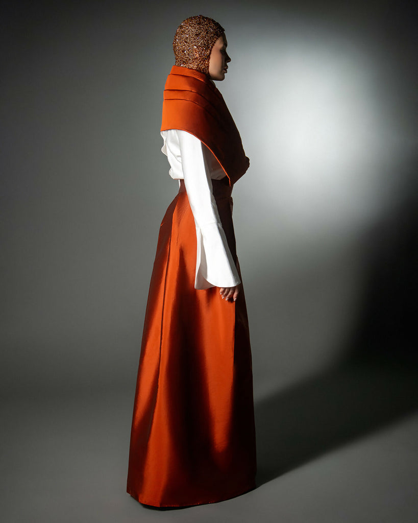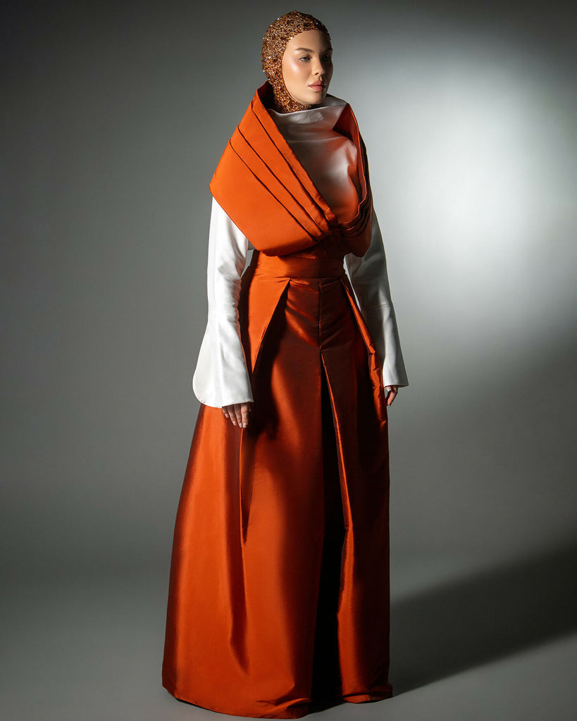 The Jude Set is a bold couture ensemble designed to merge architectural structure with modern modest elegance. Crafted in a striking burnt orange tone, the set features a sculptural shawl that is fully attached to the trousers, creating a cohesive, statuesque silhouette. The attached shawl wraps and folds around the upper body in layered, sculptural panels, giving the look its signature dramatic form.
