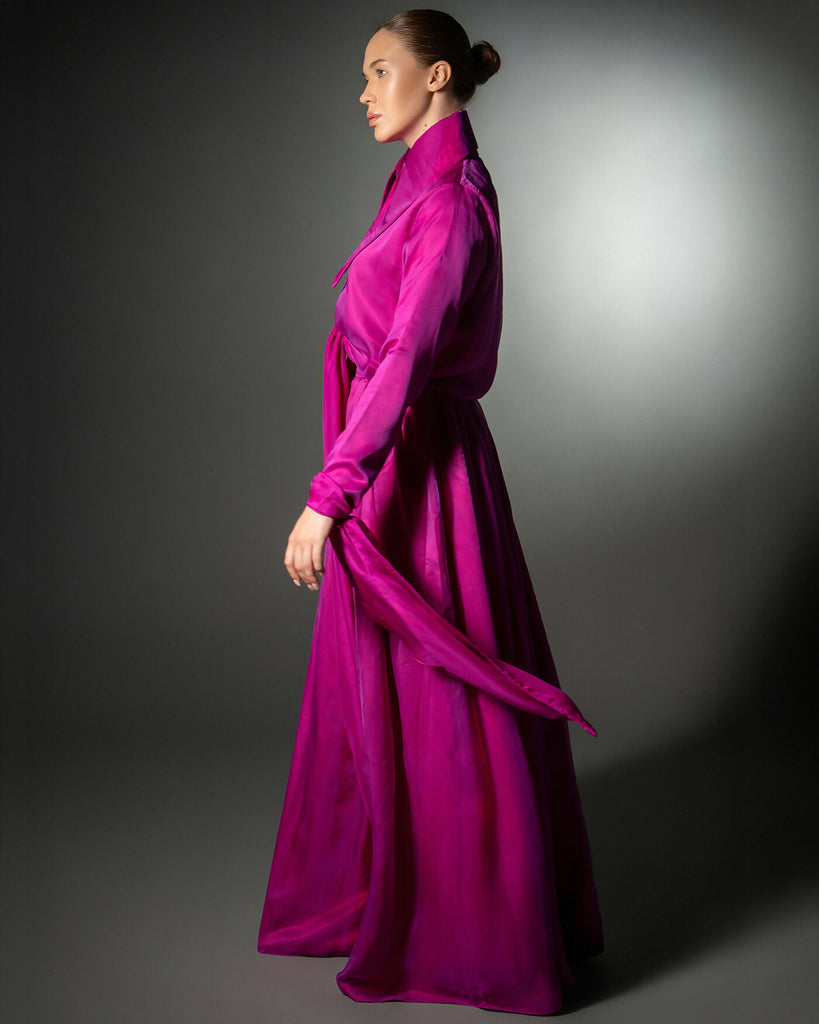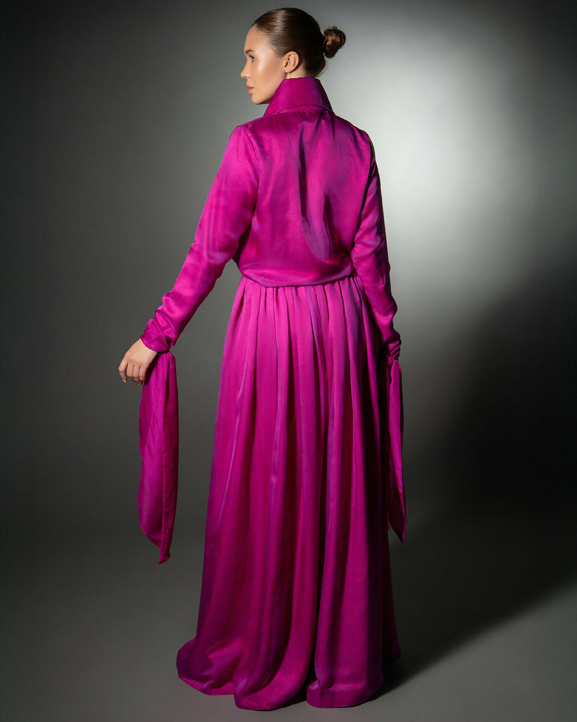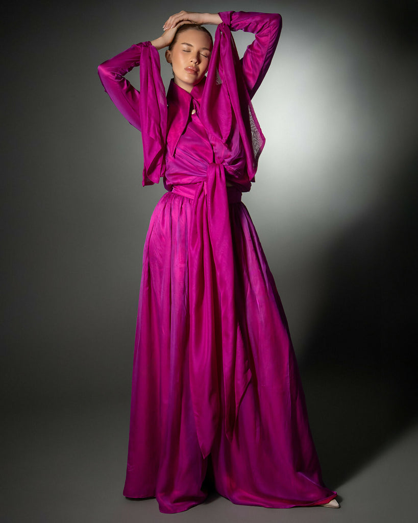 The Julia Gown is a fluid, expressive couture design crafted from vibrant fuchsia satin, created to embody movement, elegance, and feminine strength. The silhouette features a sculptural high collar and long cascading panels that wrap, tie, or drape—allowing multiple styling possibilities while maintaining a refined modest shape.