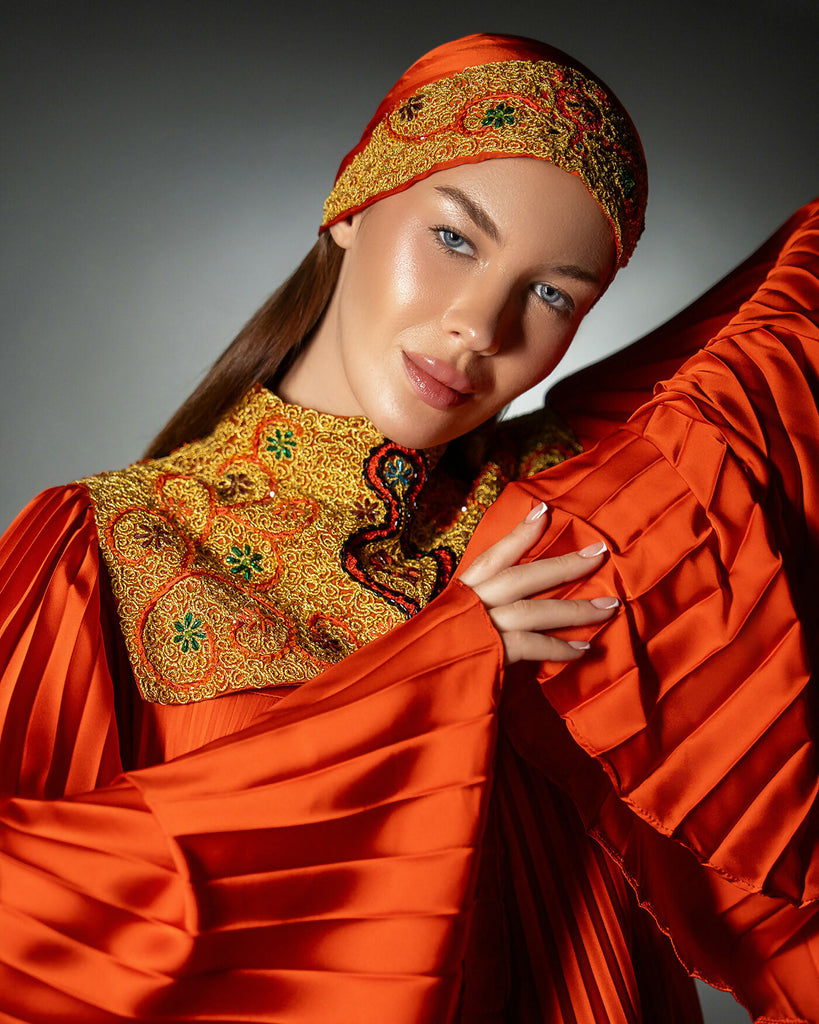 The Mays Gown is crafted from flowing pleated luxury fabric in a vibrant orange tone, designed to move beautifully with every step. The chest features intricate hand embroidery in gold, green, and red threads, inspired by traditional Palestinian craftsmanship. The gown includes a matching embroidered headpiece, allowing multiple elegant styling options.