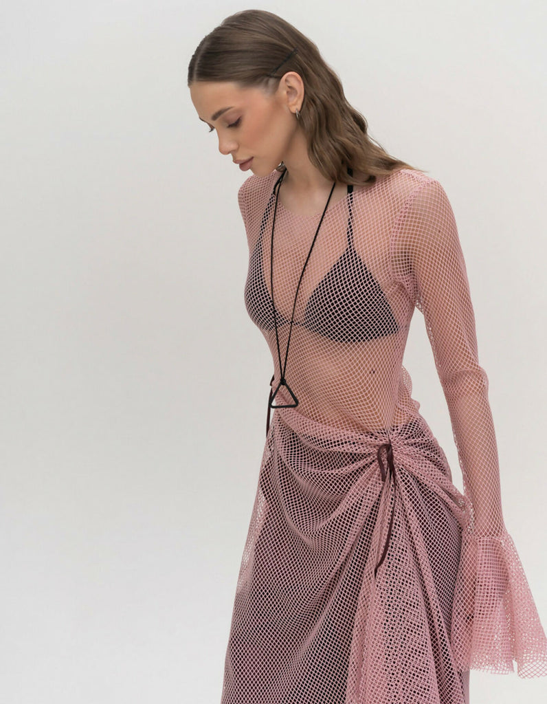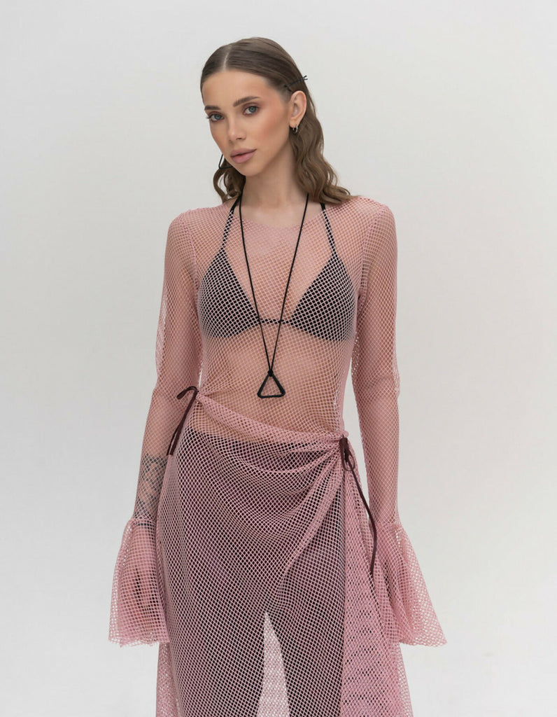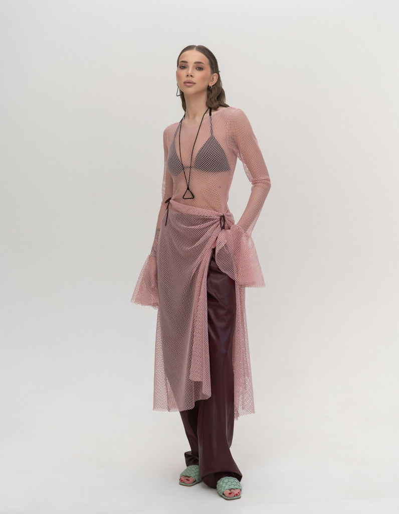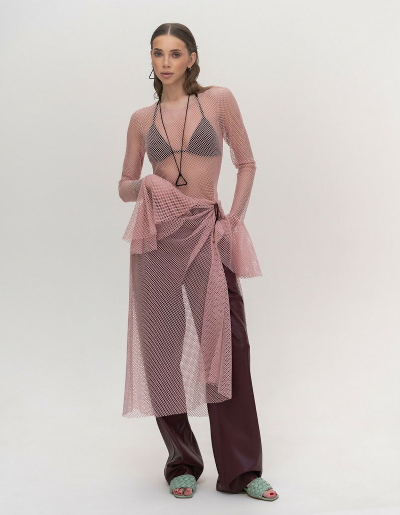 A stylish tunic dress made from delicate pink mesh, adding lightness and ethereal charm to the look. The model features ruffles on the sleeves, giving the dress a playful and romantic feel, while emphasizing a modern style.