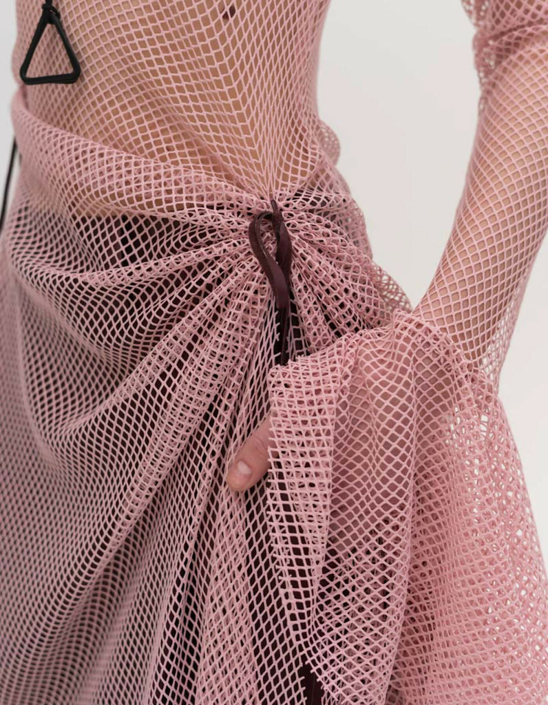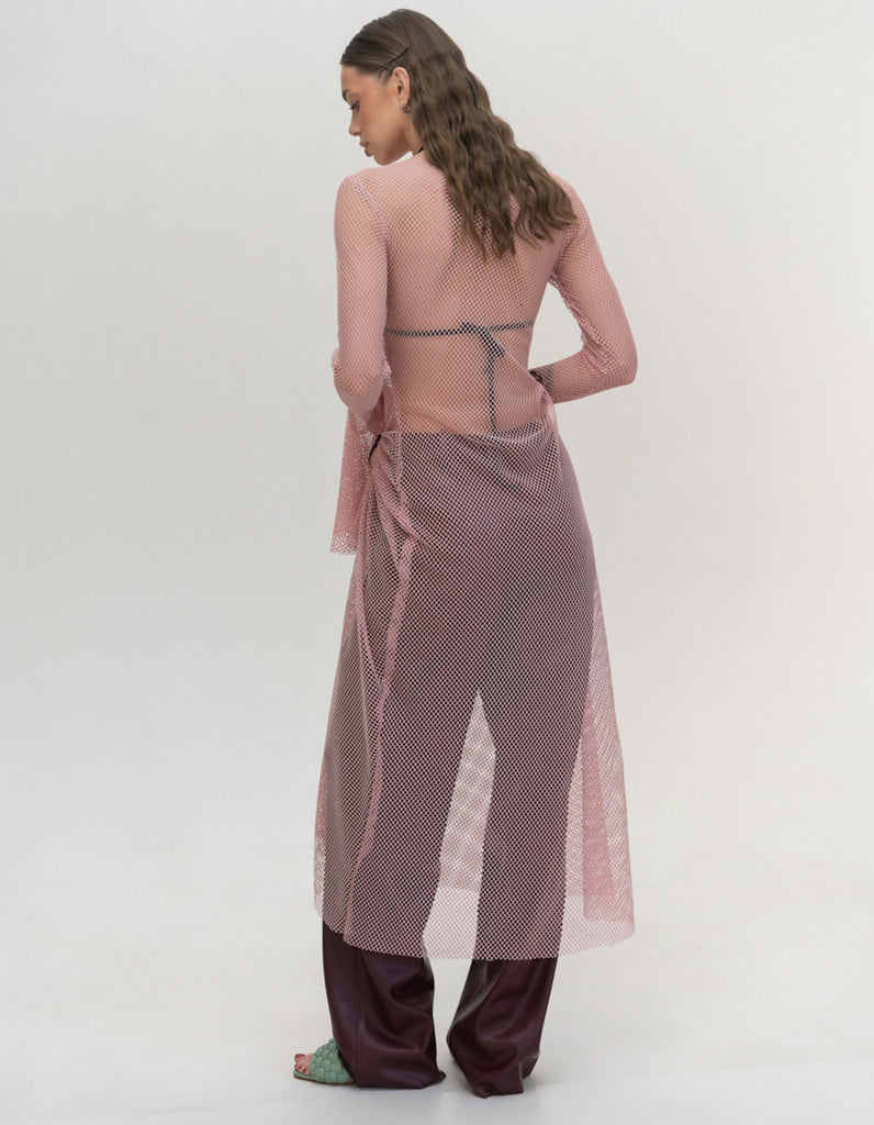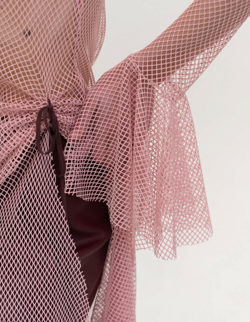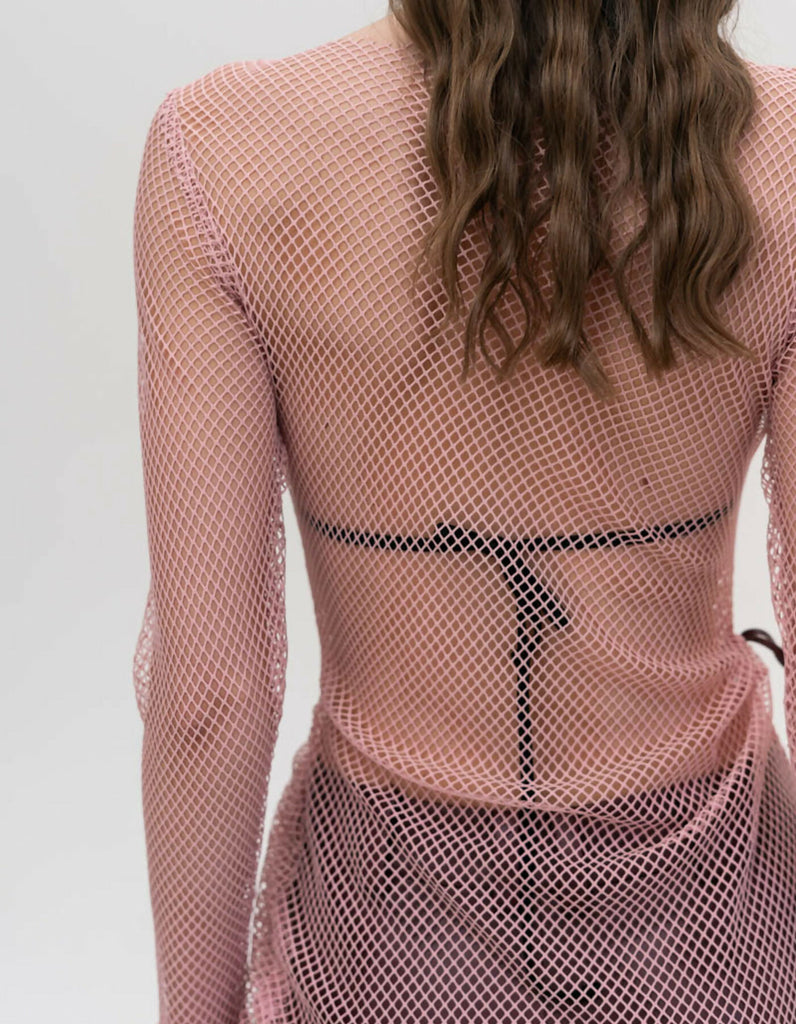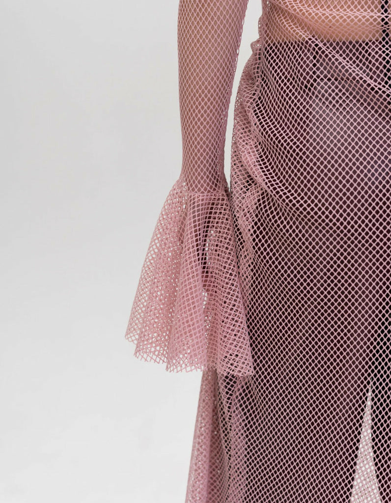 A stylish tunic dress made from delicate pink mesh, adding lightness and ethereal charm to the look. The model features ruffles on the sleeves, giving the dress a playful and romantic feel, while emphasizing a modern style.