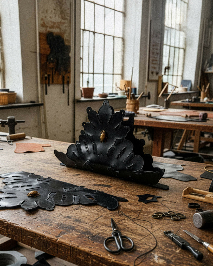 A handbag crafted from premium natural leather, distinguished by its unique sculptural form inspired by a template created by artist