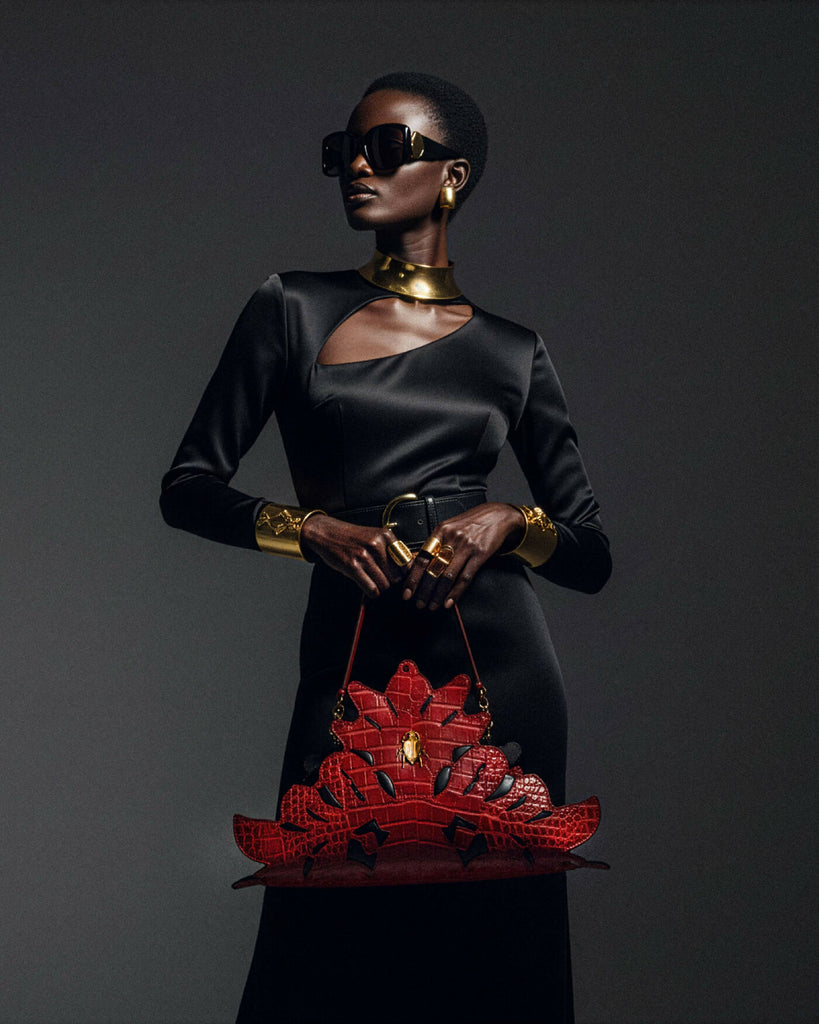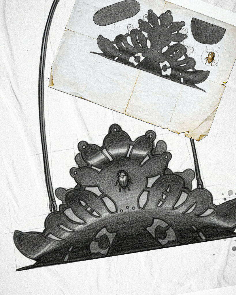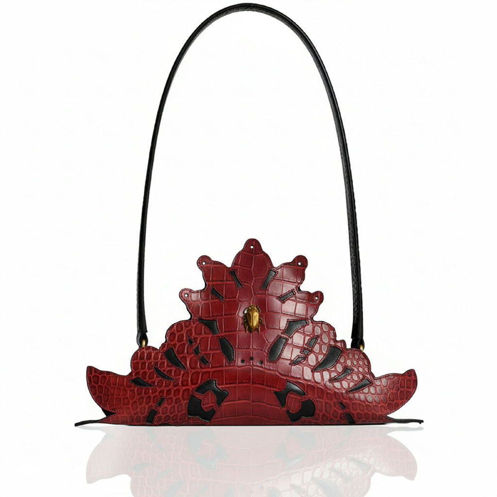 At its center, the bag features a scarab ornament, meticulously crafted using traditional metalworking techniques, serving as both an aesthetic focal point and a symbol of timeless craftsmanship.