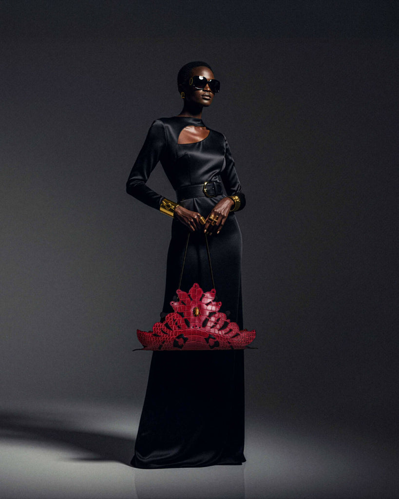 A handbag crafted from premium natural leather, distinguished by its unique sculptural form inspired by a template created by artist