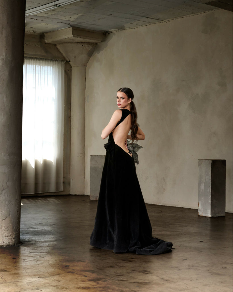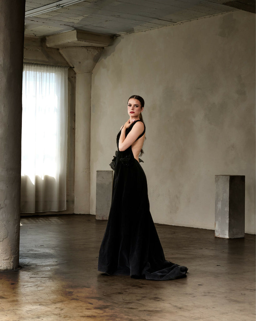 Experience the epitome of timeless glamour with a stunning, contemporary twist in this open-back velvet gown. Crafted from deep, luxurious black velvet, this dress features a sophisticated high neckline and a sleeveless silhouette that flows into a floor-sweeping A-line skirt with a subtle train. The true drama is revealed in the back: a breathtakingly deep, open scoop back, accented at its base with a large, sculptural wing-like detail that is both artistic and elegant.