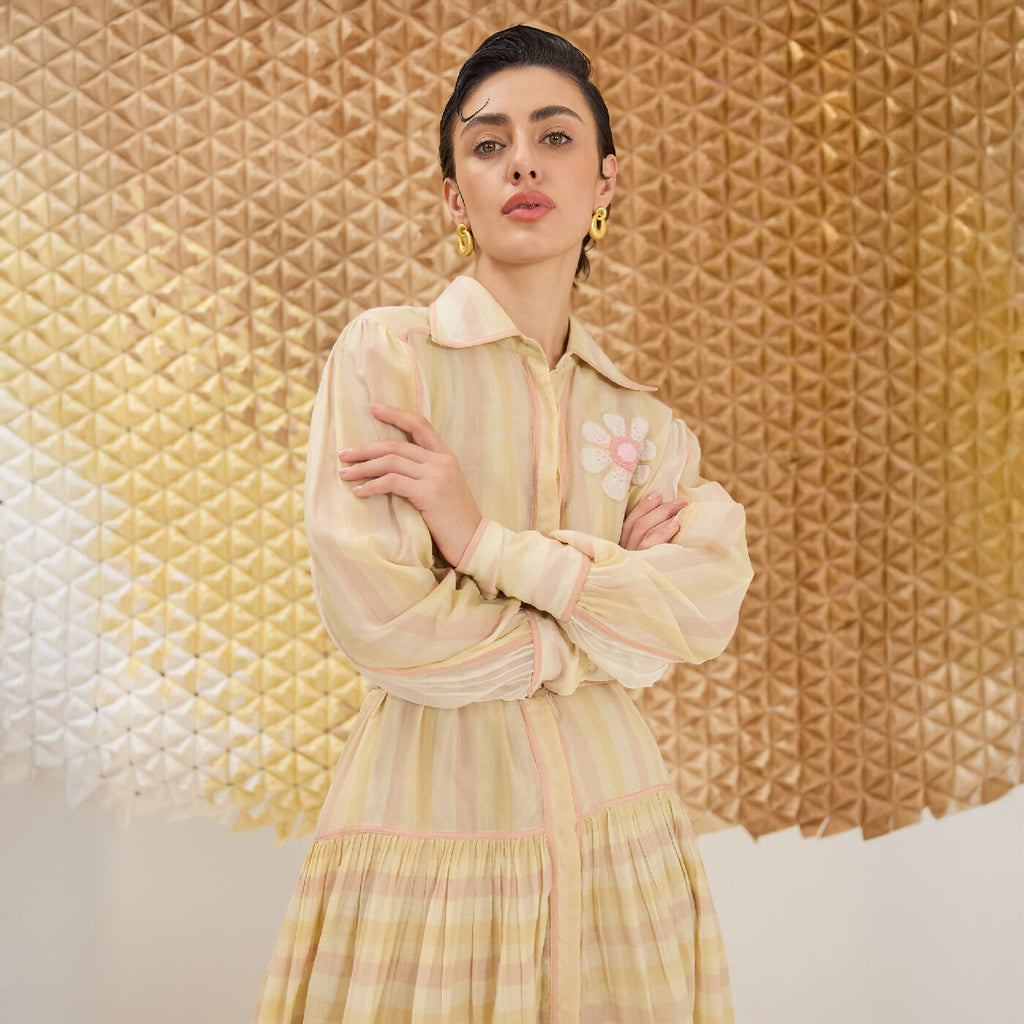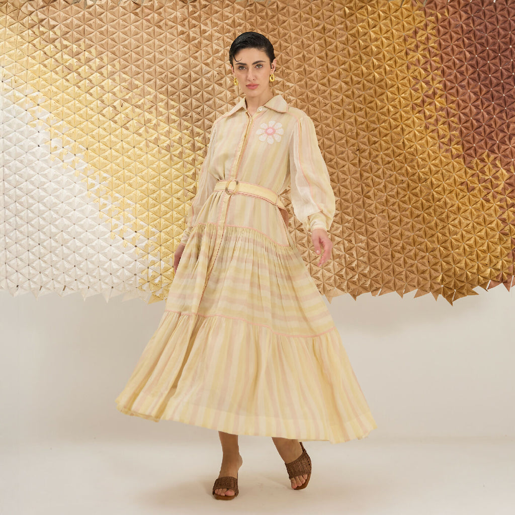 Crafted from hand woven Cotton Silk fabric this dress is a button down flowy dress with voluminous skirt resembling peony petals. Soft pastel shades like blush pink, pale white and soft peach create a romantic, ethereal vibe. Finished with a belt and hand embroidered flower this dress is an embodiment of grace and beauty.