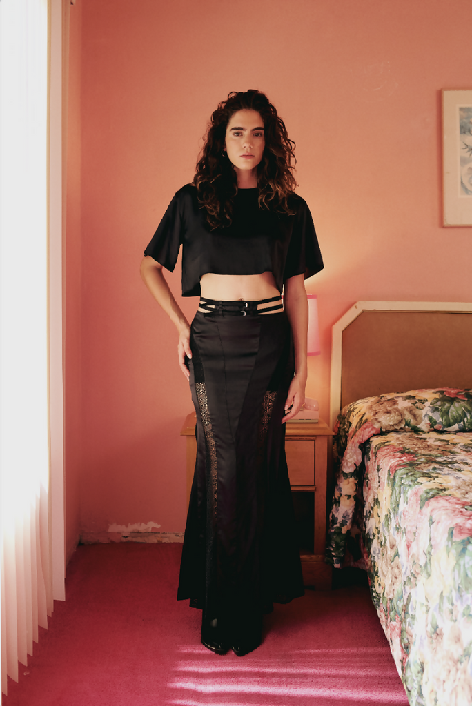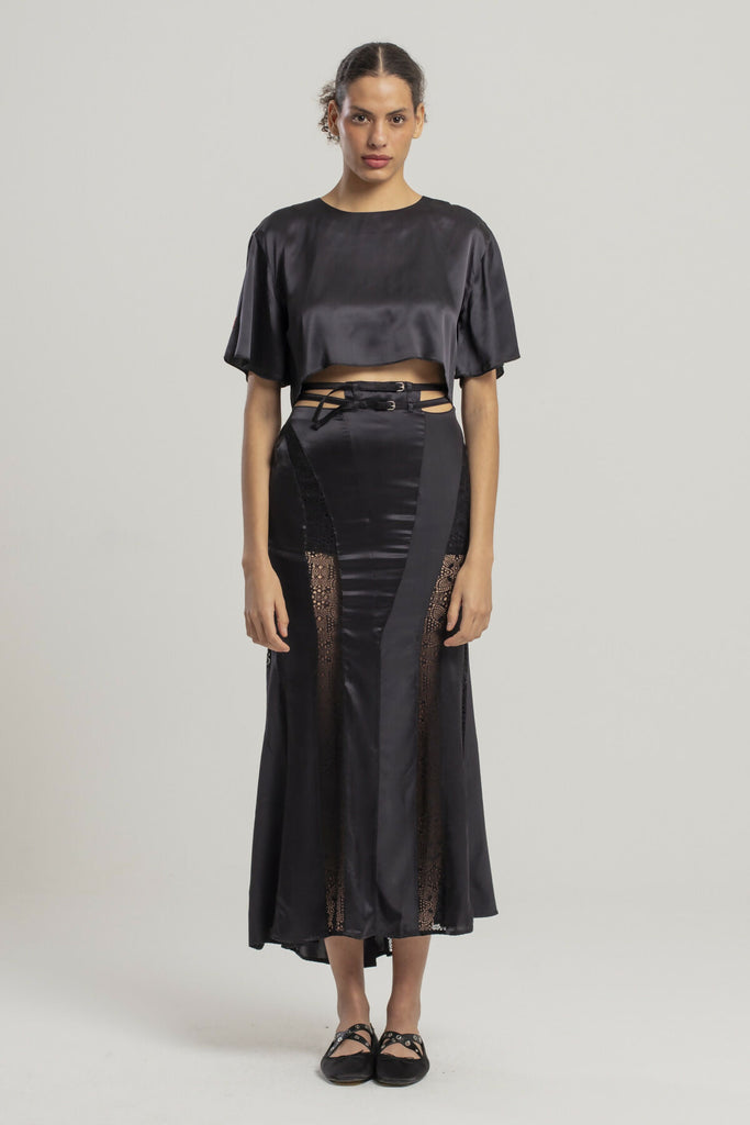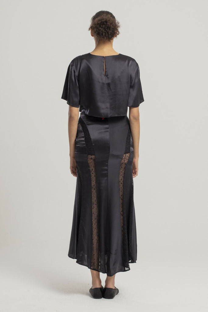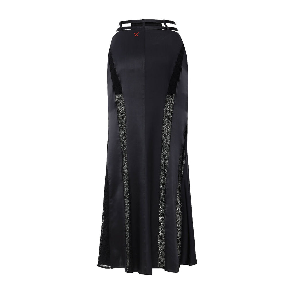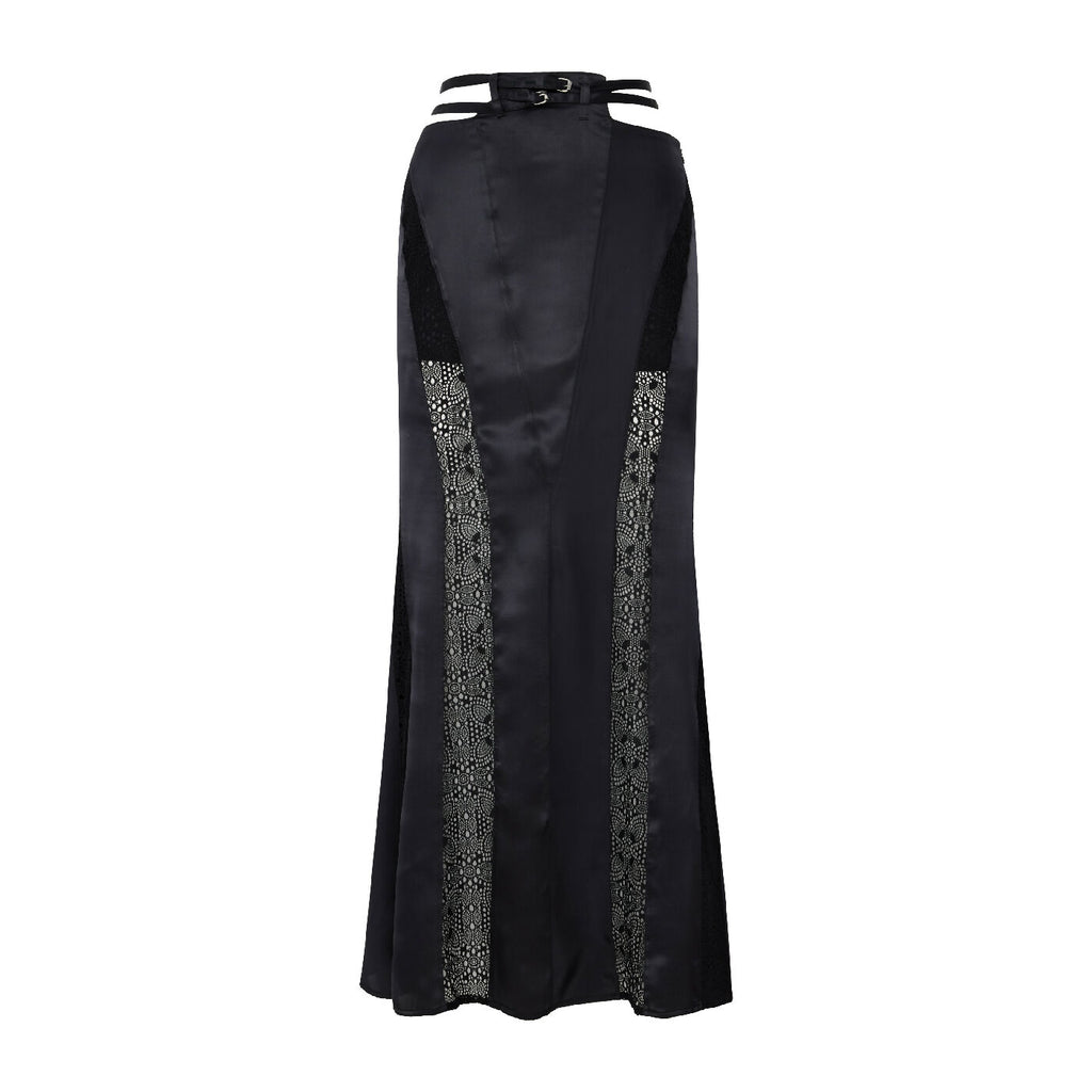 This exquisite long silk skirt features a luxurious, flowing fabric that moves gracefully. It is designed with a delicate lace belt that cinches the waist, adding a touch of elegance and sophistication. The silk's smooth texture and the intricate lace detail combine to create a refined and feminine look, perfect for formal events or upscale occasions.