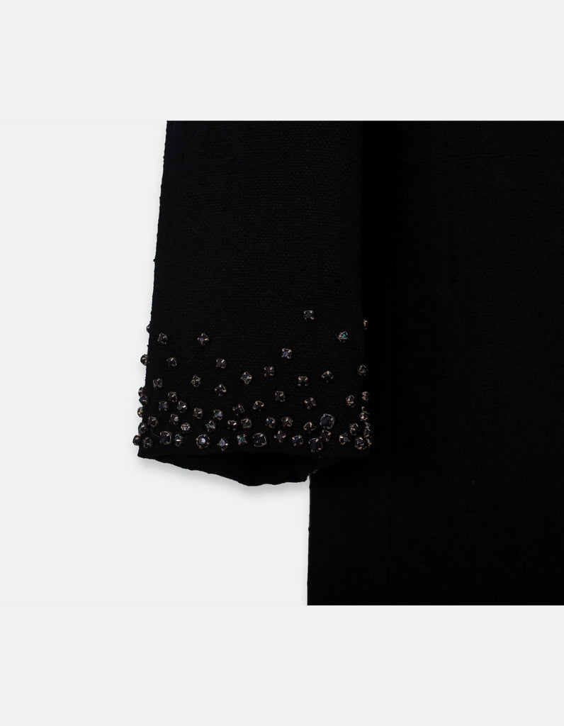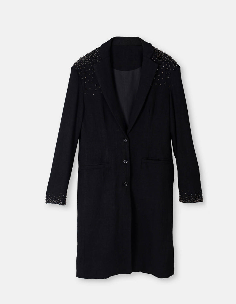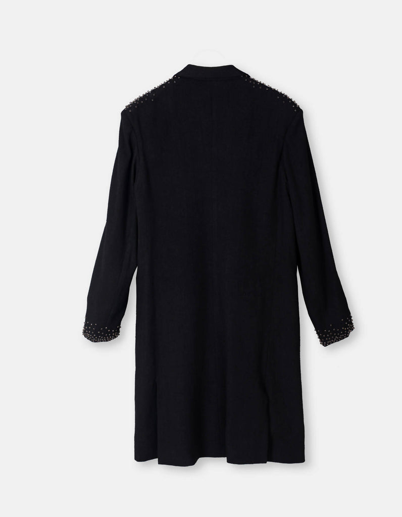 The Skadi Jacket has a traditional silhouette with large lapels and two side pockets, made from hemp and organic cotton. The lining is made from 100% organic cotton. This jacket has three buttons at the front and is bejewelled at the shoulders and ends of the sleeves with glass and metal beads.