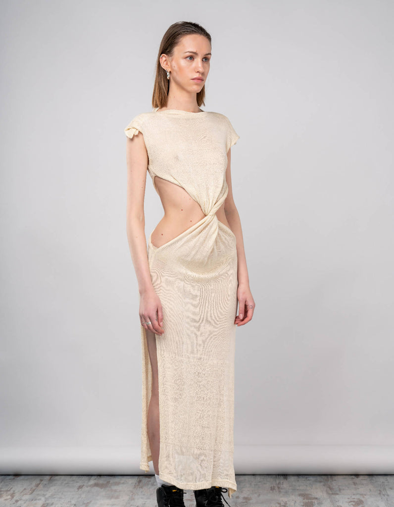 This very chic, very sheer maxi dress is made from a natural ivory knit silk. This feminine dress gets an edge from the twisted body, high side slits and raw edge construction.